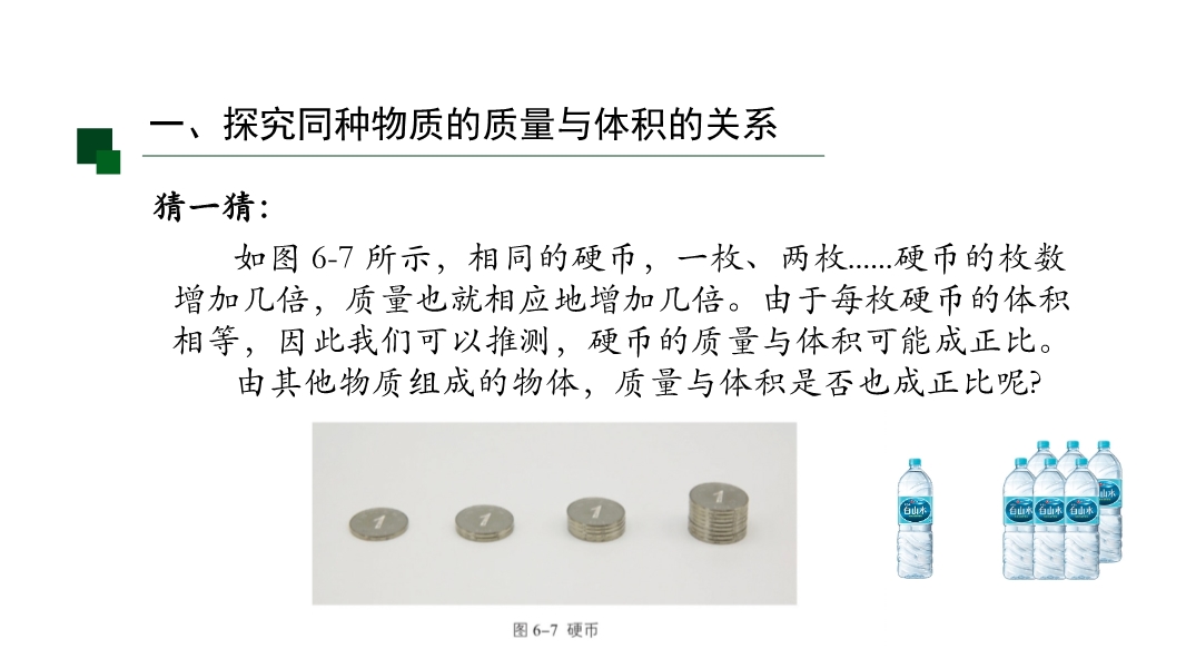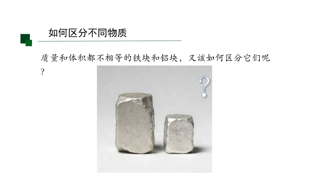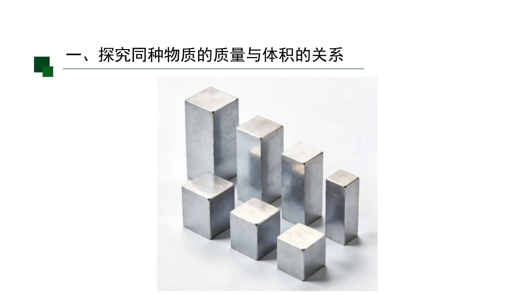 【内容简介】该初中物理课件聚焦“密度”核心知识点,涵盖密度的定义、公式、单位及质量与体积的关系。课堂导入通过递进式问题,从区分体积相等、质量相等、质量体积均不等的铁块铝块入手,引导学生从已知物质属性过渡到新属性探究,搭建认知支架连接前后知识。其亮点是以科学探究为主线,通过设计测量不同铝块铁块质量体积的实验,结合数据表格记录和图像分析,对比得出同种物质质量体积比值相同、不同物质比值不同的结论,培养科学探究能力和科学思维。同时强化物理观念,明确密度是物质特性,帮助学生建立物质观念。学生能深化理解,教师可借助完整探究流程提升教学效果。