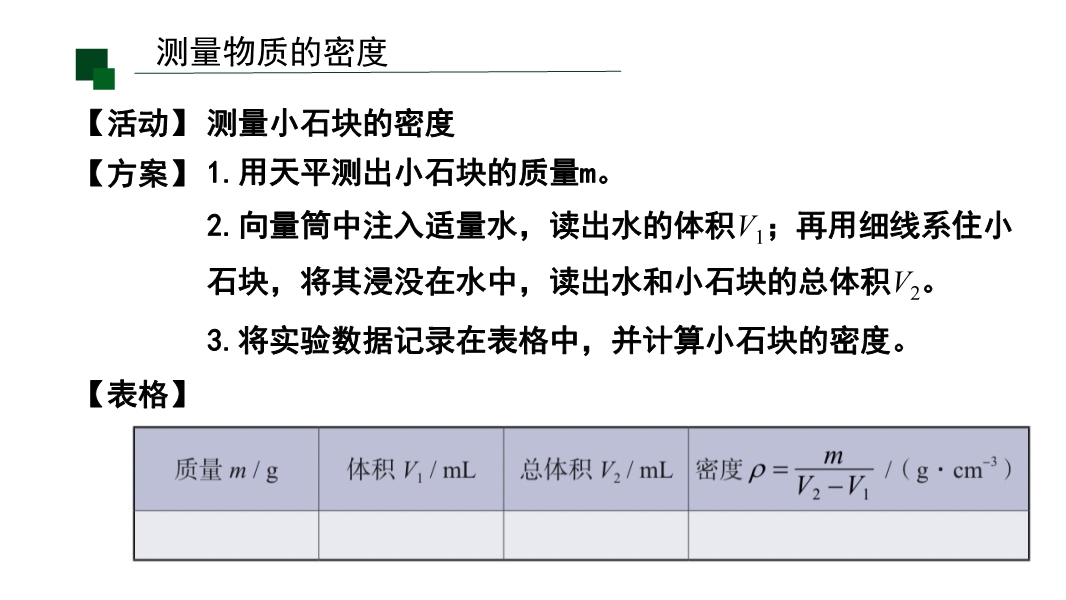 【内容简介】该初中物理课件聚焦“密度知识的应用”,系统涵盖测量固体(如小石块、蜡块)和液体(如食盐水)密度的实验方法、鉴别物质及间接测量物体质量或体积等核心内容。课堂导入通过“知识回顾”梳理密度定义、公式等旧知,结合“思考”提问如何测量不同物质密度,搭建从已有认知到新知探究的学习支架,引导学生逐步深入。其亮点在于以科学探究为核心,通过固体密度测量中的排水法步骤规范、蜡块漂浮的针压/助沉法创新,液体密度测量中方案A(烧杯残留误差)与方案B(改进步骤减误差)的对比分析,培养学生科学思维中的科学论证与质疑创新能力。融入阿基米德鉴别王冠、牛奶密度检测等生活实例,渗透科学态度与责任中的社会责任意识,结构化小结明确密度应用三方面,助力学生构建物理观念中的物质观念,既帮助学生掌握实验技能与问题解决方法,也为教师开展高效实验教学提供清晰路径。