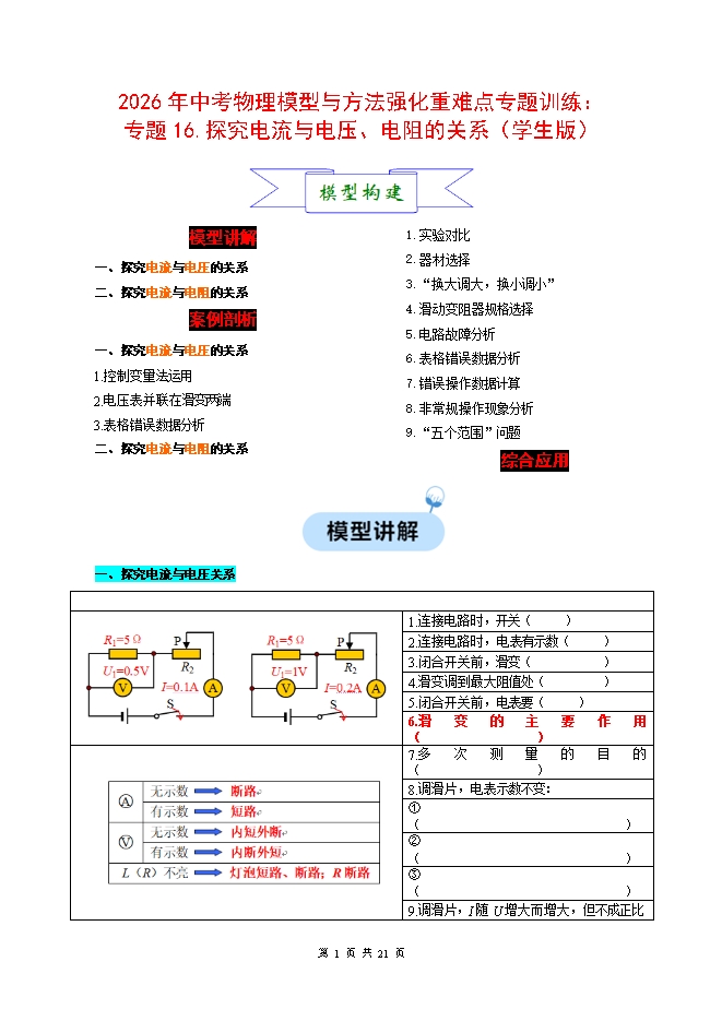 【内容简介】2026年中考物理模型与方法强化重难点专题训练:专题16.探究电流与电压、电阻的关系(学生版和教师版)
