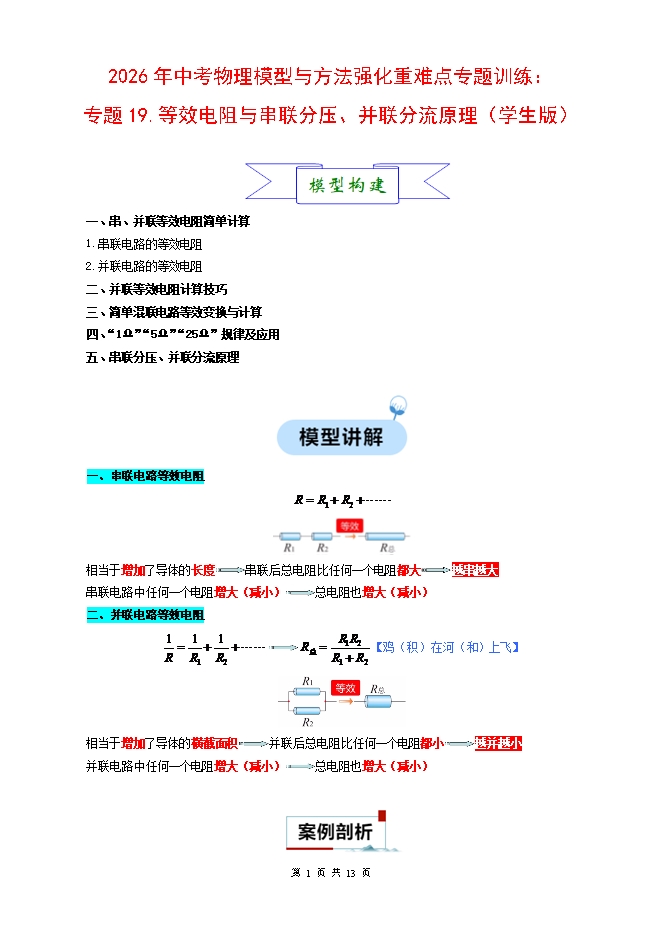 【内容简介】2026年中考物理模型与方法强化重难点专题训练:专题19.等效电阻与串联分压、并联分流原理(学生版和教师版)