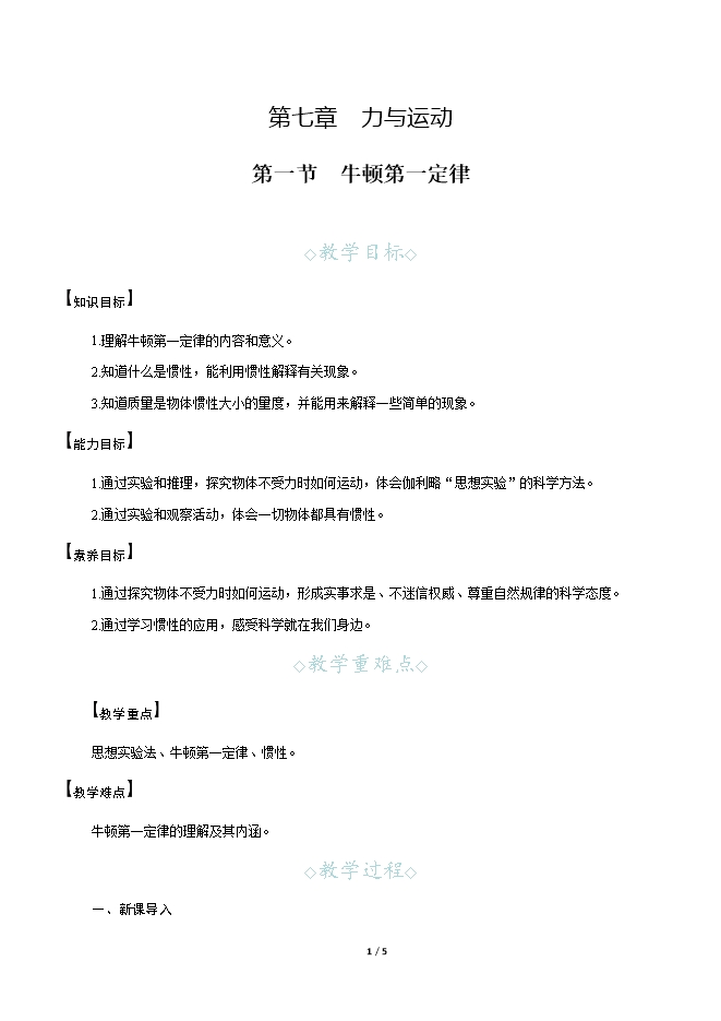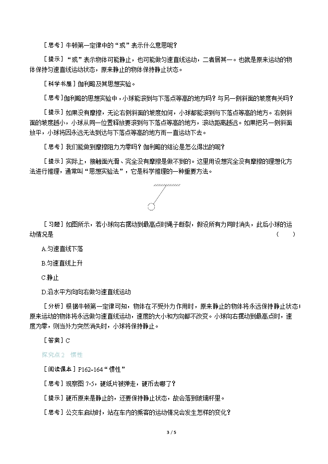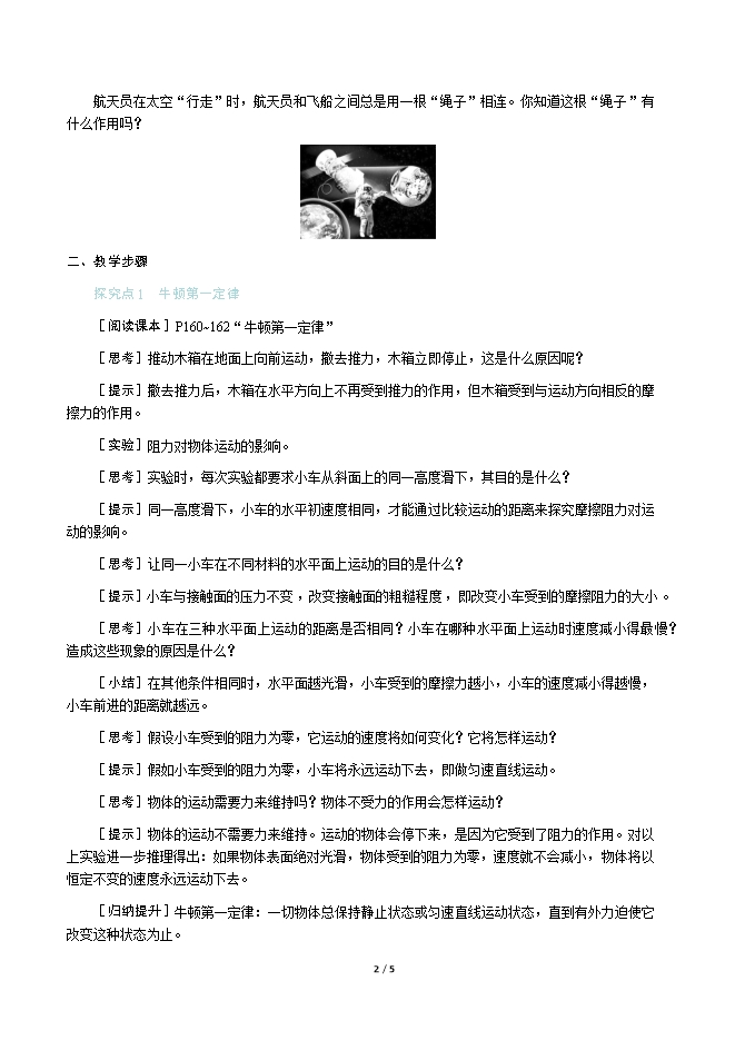 【内容简介】一、新课导入航天员在太空“行走”时,航天员和飞船之间总是用一根“绳子”相连。你知道这根“绳子”有什么作用吗? 二、教学步骤探究点1 牛顿第一定律[阅读课本]P160~162“牛顿第一定律”[思考]推动木箱在地面上向前运动,撤去推力,木箱立即停止,这是什么原因呢?[提示]撤去推力后,木箱在水平方向上不再受到推力的作用,但木箱受到与运动方向相反的摩擦力的作用。[实验]阻力对物体运动的影响。[思考]实验时,每次实验都要求小车从斜面上的同一高度滑下,其目的是什么?[提示]同一高度滑下,小车的水平初速度相同,才能通过比较运动的距离来探究摩擦阻力对运动的影响。[思考]让同一小车在不同材料的水平面上运动的目的是什么?[提示]小车与接触面的压力不变,改变接触面的粗糙程度,即改变小车受到的摩擦阻力的大小。[思考]小车在三种水平面上运动的距离是否相同?小车在哪种水平面上运动时速度减小得最慢?造成这些现象的原因是什么?[小结]在其他条件相同时,水平面越光滑,小车受到的摩擦力越小,小车的速度减小得越慢,小车前进的距离就越远。[思考]假设小车受到的阻力为零,它运动的速度将如何变化?它将怎样运动?[提示]假如小车受到的阻力为零,小车将永远运动下去,即做匀速直线运动。[思考]物体的运动需要力来维持吗?物体不受力的作用会怎样运动?[提示]物体的运动不需要力来维持。运动的物体会停下来,是因为它受到了阻力的作用。对以上实验进一步推理得出:如果物体表面绝对光滑,物体受到的阻力为零,速度就不会减小,物体将以恒定不变的速度永远运动下去。