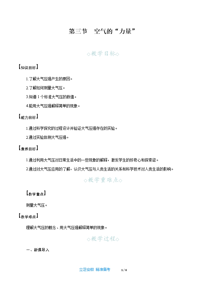 - 3598.3 空气的“力量”--2024新沪科版物理八年级下学期科学素养新教学设计(附教学反思)