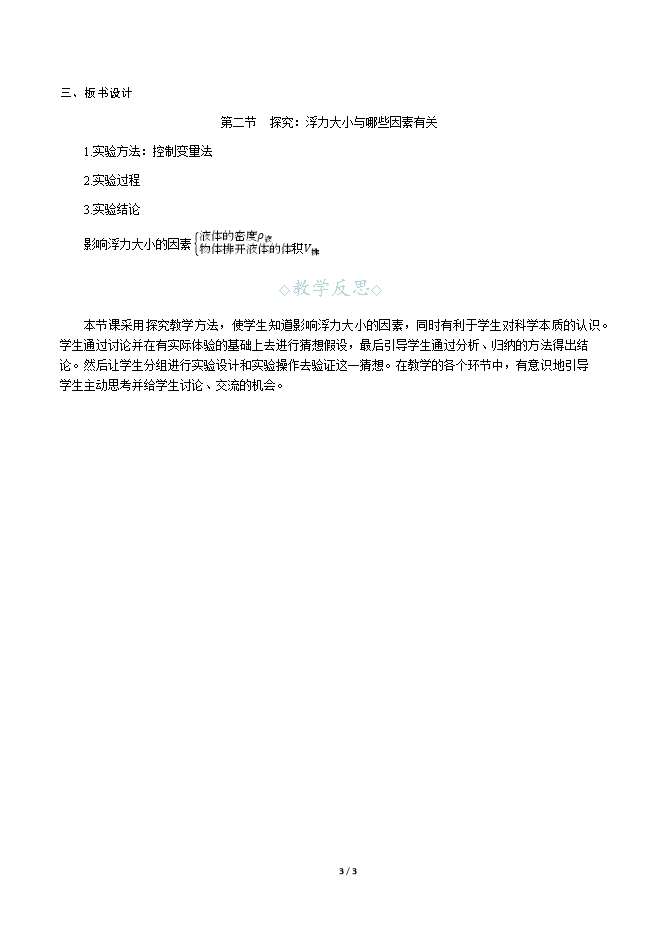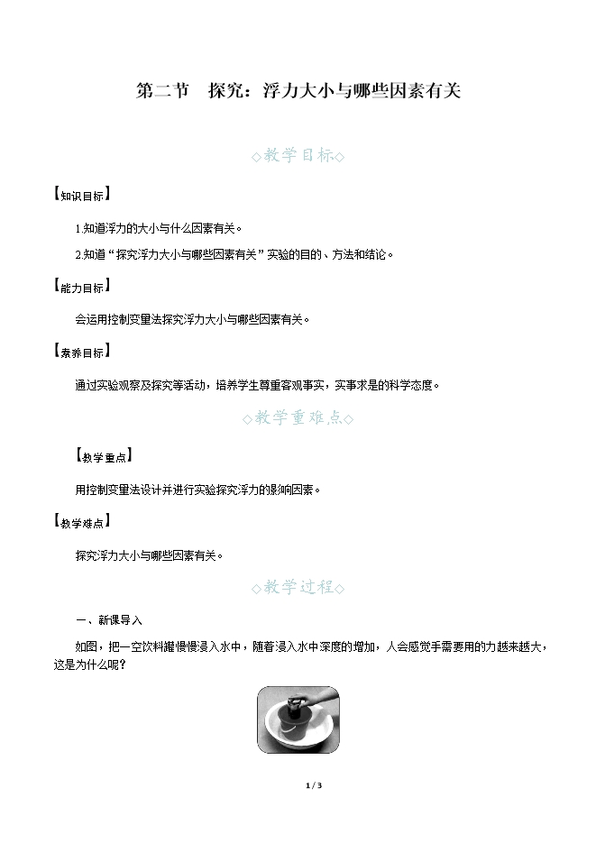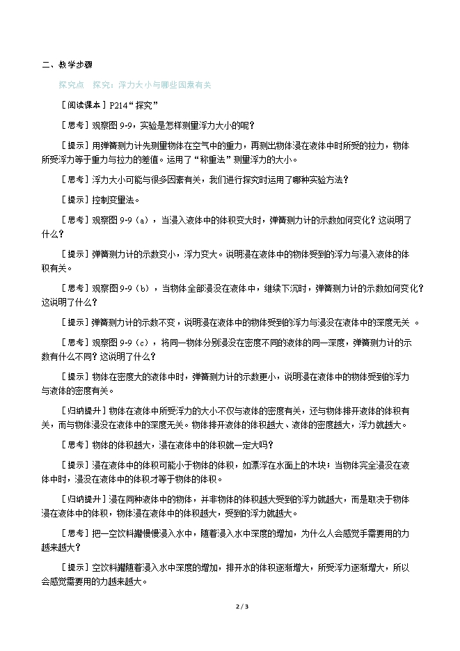 【内容简介】一、新课导入如图,把一空饮料罐慢慢浸入水中,随着浸入水中深度的增加,人会感觉手需要用的力越来越大,这是为什么呢? 二、教学步骤探究点 探究:浮力大小与哪些因素有关[阅读课本]P214“探究”[思考]观察图9⁃9,实验是怎样测量浮力大小的呢?[提示]用弹簧测力计先测量物体在空气中的重力,再测出物体浸在液体中时所受的拉力,物体所受浮力等于重力与拉力的差值。运用了“称重法”测量浮力的大小。[思考]浮力大小可能与很多因素有关,我们进行探究时运用了哪种实验方法?[提示]控制变量法。[思考]观察图9⁃9(a),当浸入液体中的体积变大时,弹簧测力计的示数如何变化?这说明了什么?[提示]弹簧测力计的示数变小,浮力变大。说明浸在液体中的物体受到的浮力与浸入液体的体积有关。[思考]观察图9⁃9(b),当物体全部浸没在液体中,继续下沉时,弹簧测力计的示数如何变化?这说明了什么?[提示]弹簧测力计的示数不变,说明浸在液体中的物体受到的浮力与浸没在液体中的深度无关。[思考]观察图9⁃9(c),将同一物体分别浸没在密度不同的液体的同一深度,弹簧测力计的示数有什么不同?这说明了什么?[提示]物体在密度大的液体中时,弹簧测力计的示数更小,说明浸在液体中的物体受到的浮力与液体的密度有关。[归纳提升]物体在液体中所受浮力的大小不仅与液体的密度有关,还与物体排开液体的体积有关,而与物体浸没在液体中的深度无关。物体排开液体的体积越大、液体的密度越大,浮力就越大。[思考]物体的体积越大,浸在液体中的体积就一定大吗?