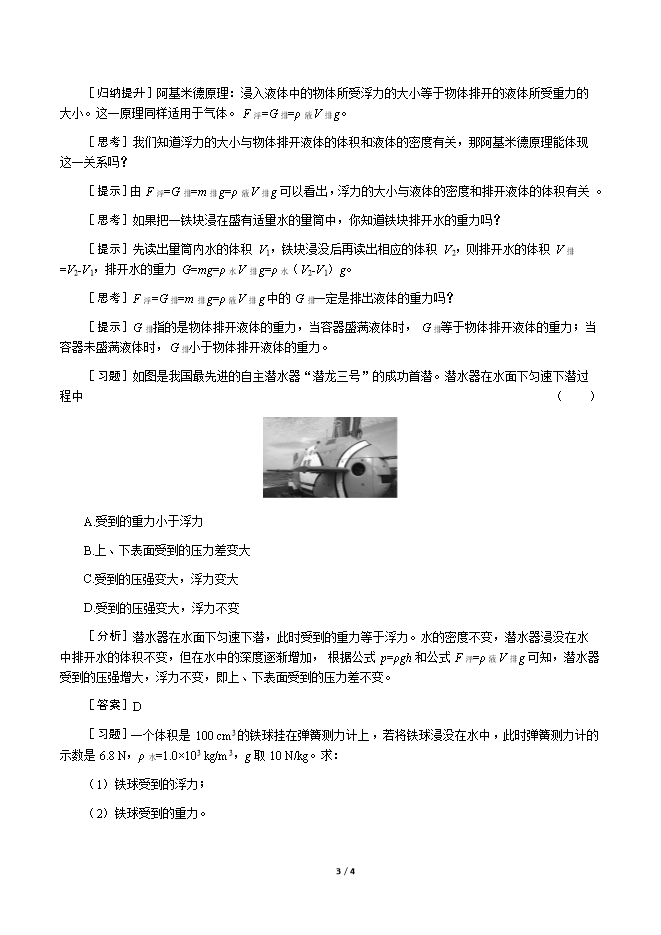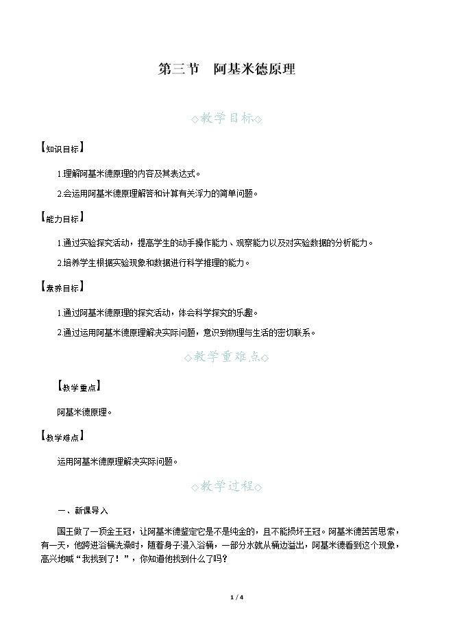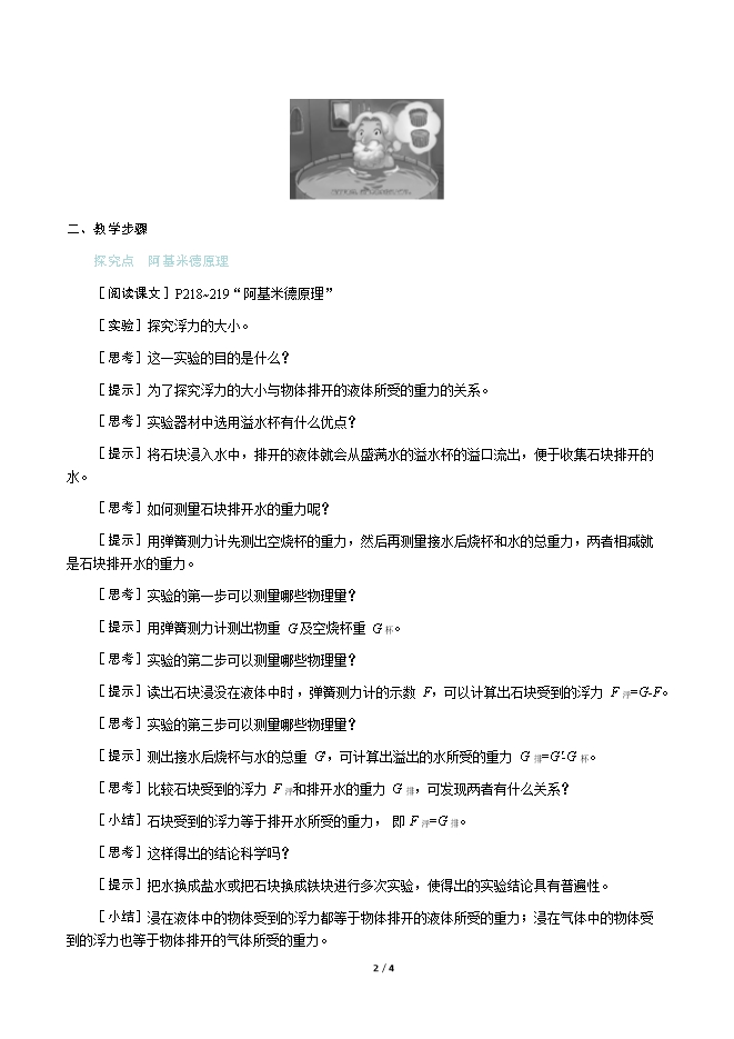 【内容简介】一、新课导入国王做了一顶金王冠,让阿基米德鉴定它是不是纯金的,且不能损坏王冠。阿基米德苦苦思索,有一天,他跨进浴桶洗澡时,随着身子浸入浴桶,一部分水就从桶边溢出,阿基米德看到这个现象,高兴地喊“我找到了!”,你知道他找到什么了吗? 二、教学步骤探究点 阿基米德原理[阅读课文]P218~219“阿基米德原理”[实验]探究浮力的大小。[思考]这一实验的目的是什么?[提示]为了探究浮力的大小与物体排开的液体所受的重力的关系。[思考]实验器材中选用溢水杯有什么优点?[提示]将石块浸入水中,排开的液体就会从盛满水的溢水杯的溢口流出,便于收集石块排开的水。[思考]如何测量石块排开水的重力呢?[提示]用弹簧测力计先测出空烧杯的重力,然后再测量接水后烧杯和水的总重力,两者相减就是石块排开水的重力。[思考]实验的第一步可以测量哪些物理量?[提示]用弹簧测力计测出物重G及空烧杯重G杯。[思考]实验的第二步可以测量哪些物理量?[提示]读出石块浸没在液体中时,弹簧测力计的示数F,可以计算出石块受到的浮力F浮=G-F。[思考]实验的第三步可以测量哪些物理量?