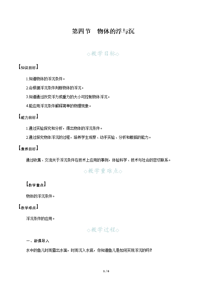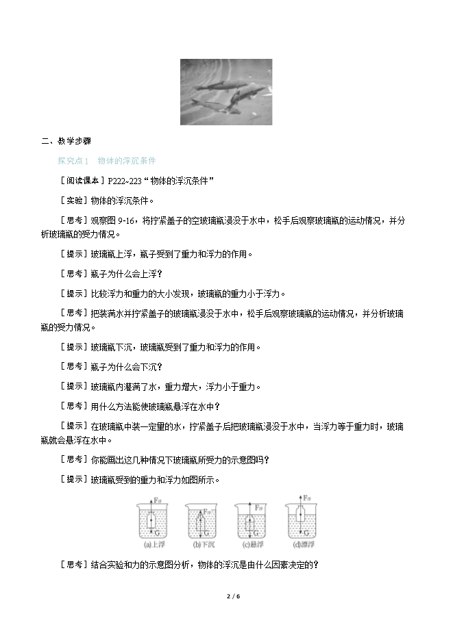 【内容简介】一、新课导入水中的鱼儿时而露出水面,时而沉入水底,你知道鱼儿是如何实现浮沉的吗?二、教学步骤探究点1 物体的浮沉条件[阅读课本]P222~223“物体的浮沉条件”[实验]物体的浮沉条件。[思考]观察图9⁃16,将拧紧盖子的空玻璃瓶浸没于水中,松手后观察玻璃瓶的运动情况,并分析玻璃瓶的受力情况。[提示]玻璃瓶上浮,瓶子受到了重力和浮力的作用。[思考]瓶子为什么会上浮?[提示]比较浮力和重力的大小发现,玻璃瓶的重力小于浮力。[思考]把装满水并拧紧盖子的玻璃瓶浸没于水中,松手后观察玻璃瓶的运动情况,并分析玻璃瓶的受力情况。[提示]玻璃瓶下沉,玻璃瓶受到了重力和浮力的作用。[思考]瓶子为什么会下沉?[提示]玻璃瓶内灌满了水,重力增大,浮力小于重力。[思考]用什么方法能使玻璃瓶悬浮在水中?[提示]在玻璃瓶中装一定量的水,拧紧盖子后把玻璃瓶浸没于水中,当浮力等于重力时,玻璃瓶就会悬浮在水中。[思考]你能画出这几种情况下玻璃瓶所受力的示意图吗?