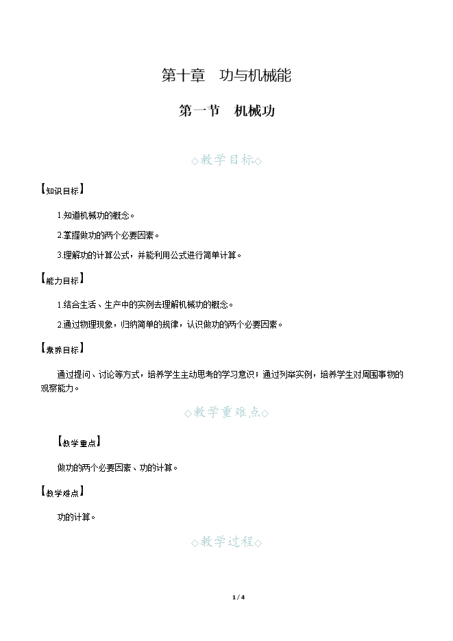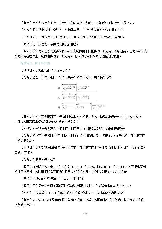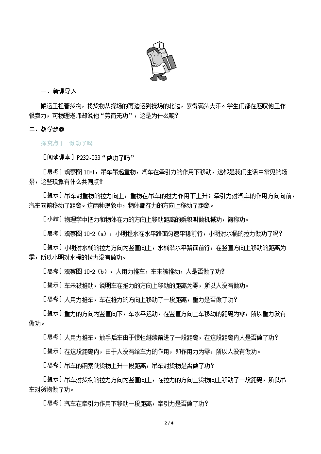 【内容简介】一、新课导入搬运工扛着货物,将货物从操场的南边运到操场的北边,累得满头大汗。学生们都在感叹他工作很卖力,可物理老师却说他“劳而无功”,这是为什么呢?二、教学步骤探究点1 做功了吗[阅读课本]P232~233“做功了吗”[思考]观察图10⁃1,吊车吊起重物,汽车在牵引力的作用下移动,这都是我们生活中常见的场景,这些现象有什么共同点?[提示]吊车对重物的拉力向上,重物在吊车的拉力作用下上升;牵引力对汽车的作用方向向前,汽车向前移动了距离。这两种现象中,物体都在力的方向上移动了距离。[小结]物理学中把力和物体在力的方向上移动距离的乘积叫做机械功,简称功。[思考]观察图10⁃2(a),小明提水在水平路面匀速平稳前行,小明对水桶的拉力做功了吗?[提示]小明对水桶的拉力方向为竖直向上,水桶沿水平路面前行,在竖直方向上移动的距离为零,所以小明对水桶的拉力没有做功。[思考]观察图10⁃2(b),人用力推车,车未被推动,人是否做了功?[提示]车未被推动,说明车在推力的方向上移动的距离为零,所以人没有做功。[思考]人用力推车,车在推力的方向上移动了一段距离,重力是否做了功?[提示]重力的方向为竖直向下,车水平运动,在竖直方向上车移动的距离为零,所以重力没有做功。[思考]人用力推车,放手后车由于惯性继续前进了一段距离,在这段距离内人是否做了功?[提示]在这段距离内,由于人没有给车力的作用,即作用力为零,所以人没有做功。[思考]吊车的钢索使货物上升一段距离,吊车对货物是否做了功?[提示]吊车对货物的拉力方向为竖直向上,在拉力的方向上货物向上移动了一段距离,所以吊车对货物做了功。[思考]汽车在牵引力作用下移动一段距离,牵引力是否做了功?