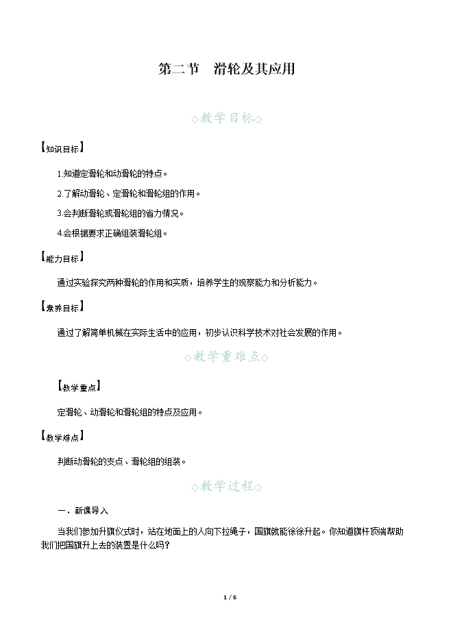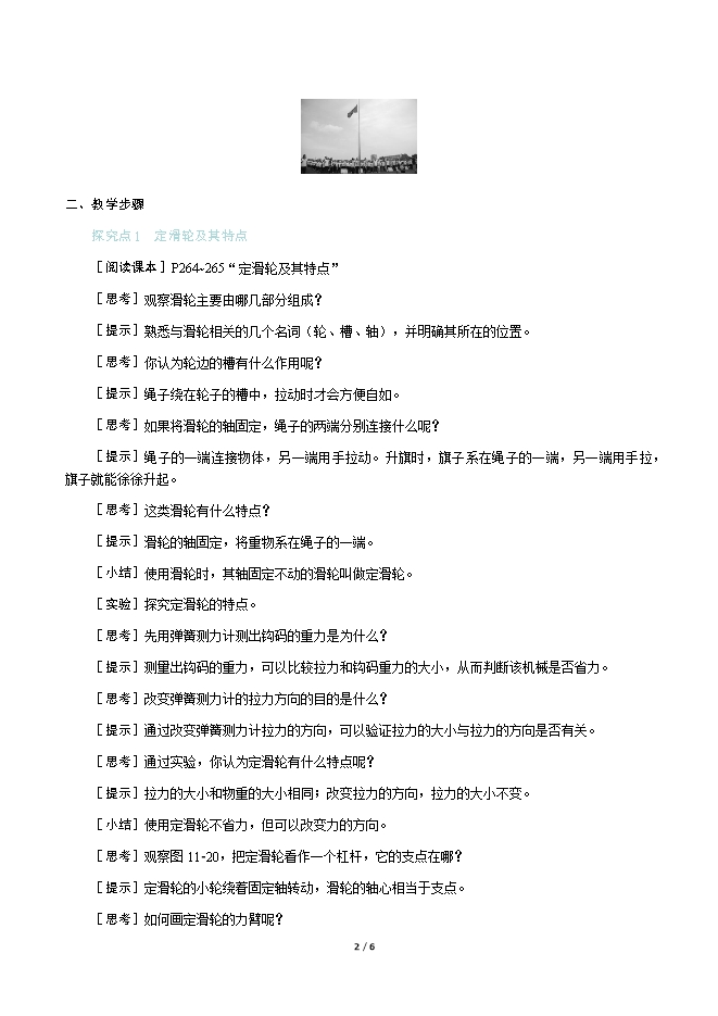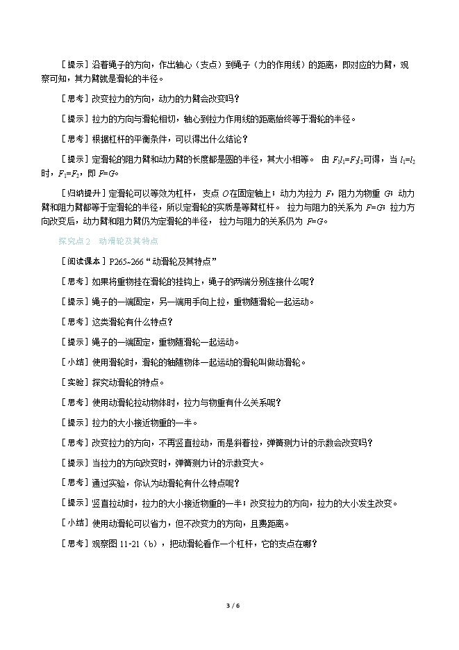 【内容简介】一、新课导入当我们参加升旗仪式时,站在地面上的人向下拉绳子,国旗就能徐徐升起。你知道旗杆顶端帮助我们把国旗升上去的装置是什么吗? 二、教学步骤探究点1 定滑轮及其特点[阅读课本]P264~265“定滑轮及其特点”[思考]观察滑轮主要由哪几部分组成?[提示]熟悉与滑轮相关的几个名词(轮、槽、轴),并明确其所在的位置。[思考]你认为轮边的槽有什么作用呢?[提示]绳子绕在轮子的槽中,拉动时才会方便自如。[思考]如果将滑轮的轴固定,绳子的两端分别连接什么呢?[提示]绳子的一端连接物体,另一端用手拉动。升旗时,旗子系在绳子的一端,另一端用手拉,旗子就能徐徐升起。[思考]这类滑轮有什么特点?[提示]滑轮的轴固定,将重物系在绳子的一端。[小结]使用滑轮时,其轴固定不动的滑轮叫做定滑轮。[实验]探究定滑轮的特点。[思考]先用弹簧测力计测出钩码的重力是为什么?[提示]测量出钩码的重力,可以比较拉力和钩码重力的大小,从而判断该机械是否省力。[思考]改变弹簧测力计的拉力方向的目的是什么?[提示]通过改变弹簧测力计拉力的方向,可以验证拉力的大小与拉力的方向是否有关。[思考]通过实验,你认为定滑轮有什么特点呢?[提示]拉力的大小和物重的大小相同;改变拉力的方向,拉力的大小不变。[小结]使用定滑轮不省力,但可以改变力的方向。[思考]观察图11⁃20,把定滑轮看作一个杠杆,它的支点在哪?[提示]定滑轮的小轮绕着固定轴转动,滑轮的轴心相当于支点。