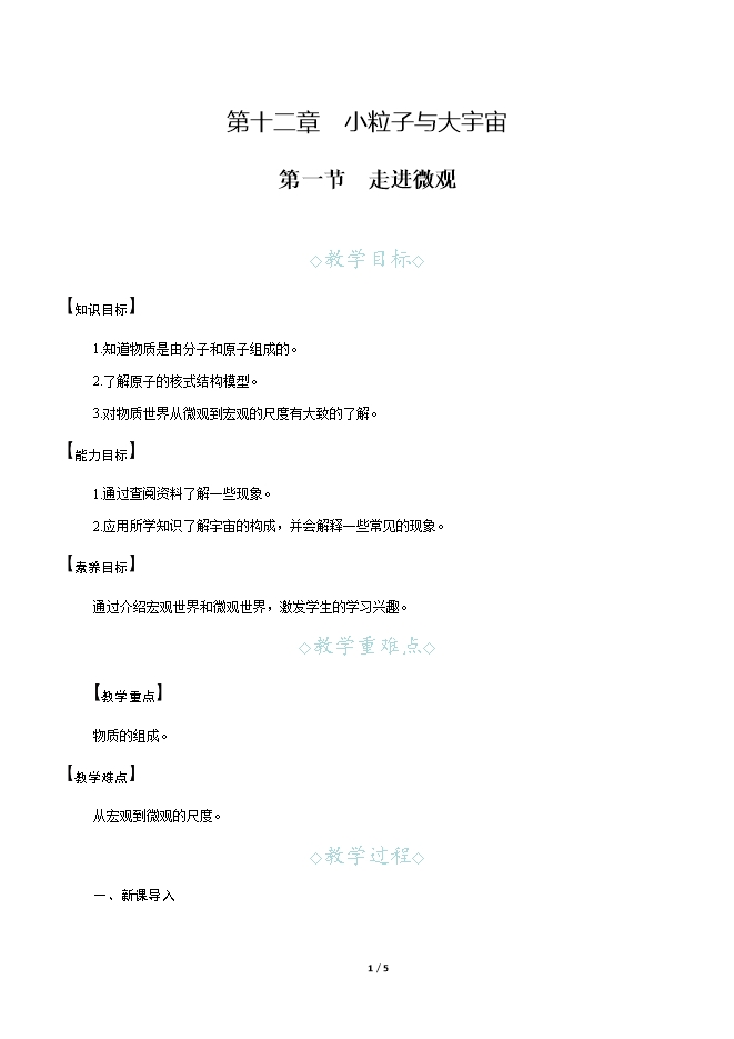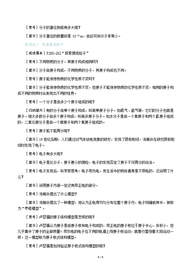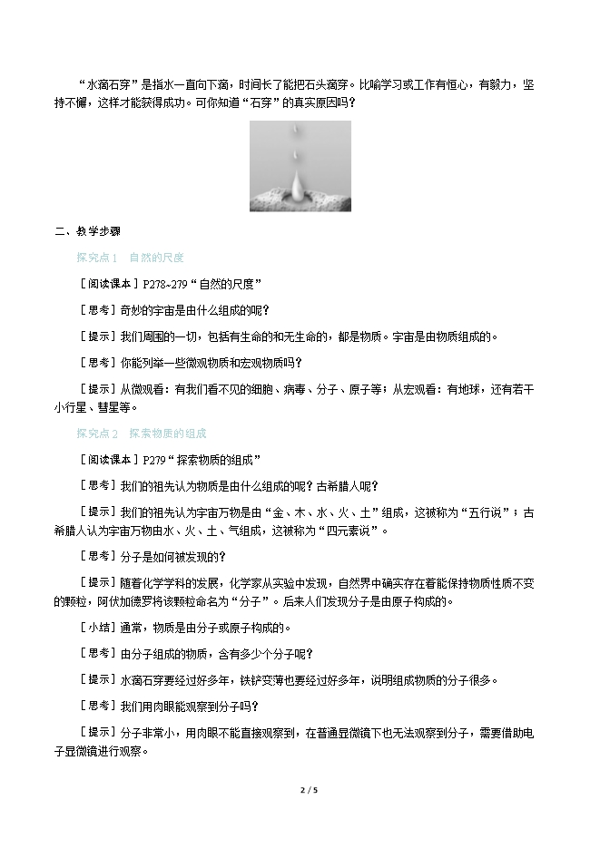【内容简介】一、新课导入“水滴石穿”是指水一直向下滴,时间长了能把石头滴穿。比喻学习或工作有恒心,有毅力,坚持不懈,这样才能获得成功。可你知道“石穿”的真实原因吗? 二、教学步骤探究点1 自然的尺度[阅读课本]P278~279“自然的尺度”[思考]奇妙的宇宙是由什么组成的呢?[提示]我们周围的一切,包括有生命的和无生命的,都是物质。宇宙是由物质组成的。[思考]你能列举一些微观物质和宏观物质吗?[提示]从微观看:有我们看不见的细胞、病毒、分子、原子等;从宏观看:有地球,还有若干小行星、彗星等。探究点2 探索物质的组成[阅读课本]P279“探索物质的组成”[思考]我们的祖先认为物质是由什么组成的呢?古希腊人呢?[提示]我们的祖先认为宇宙万物是由“金、木、水、火、土”组成,这被称为“五行说”;古希腊人认为宇宙万物由水、火、土、气组成,这被称为“四元素说”。[思考]分子是如何被发现的?[提示]随着化学学科的发展,化学家从实验中发现,自然界中确实存在着能保持物质性质不变的颗粒,阿伏加德罗将该颗粒命名为“分子”。后来人们发现分子是由原子构成的。[小结]通常,物质是由分子或原子构成的。[思考]由分子组成的物质,含有多少个分子呢?[提示]水滴石穿要经过好多年,铁铲变薄也要经过好多年,说明组成物质的分子很多。[思考]我们用肉眼能观察到分子吗?[提示]分子非常小,用肉眼不能直接观察到,在普通显微镜下也无法观察到分子,需要借助电子显微镜进行观察。一、新课导入“水滴石穿”是指水一直向下滴,时间长了能把石头滴穿。比喻学习或工作有恒心,有毅力,坚持不懈,这样才能获得成功。可你知道“石穿”的真实原因吗? 二、教学步骤探究点1 自然的尺度[阅读课本]P278~279“自然的尺度”[思考]奇妙的宇宙是由什么组成的呢?[提示]我们周围的一切,包括有生命的和无生命的,都是物质。宇宙是由物质组成的。[思考]你能列举一些微观物质和宏观物质吗?[提示]从微观看:有我们看不见的细胞、病毒、分子、原子等;从宏观看:有地球,还有若干小行星、彗星等。探究点2 探索物质的组成[阅读课本]P279“探索物质的组成”[思考]我们的祖先认为物质是由什么组成的呢?古希腊人呢?[提示]我们的祖先认为宇宙万物是由“金、木、水、火、土”组成,这被称为“五行说”;古希腊人认为宇宙万物由水、火、土、气组成,这被称为“四元素说”。[思考]分子是如何被发现的?[提示]随着化学学科的发展,化学家从实验中发现,自然界中确实存在着能保持物质性质不变的颗粒,阿伏加德罗将该颗粒命名为“分子”。后来人们发现分子是由原子构成的。[小结]通常,物质是由分子或原子构成的。[思考]由分子组成的物质,含有多少个分子呢?[提示]水滴石穿要经过好多年,铁铲变薄也要经过好多年,说明组成物质的分子很多。[思考]我们用肉眼能观察到分子吗?[提示]分子非常小,用肉眼不能直接观察到,在普通显微镜下也无法观察到分子,需要借助电子显微镜进行观察。