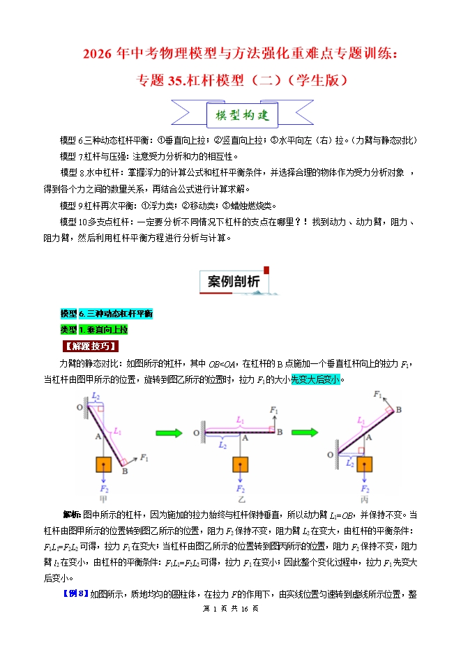 【内容简介】2026年中考物理模型与方法强化重难点专题训练:专题35.杠杆模型(二)(学生版和教师版)