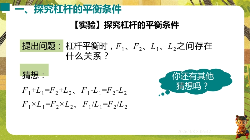 【内容简介】课件聚焦杠杆核心知识,涵盖杠杆定义、五要素、平衡条件及应用分类。通过“观察工具共同点”导入,从生活实例抽象出杠杆模型,逐步引导学生探究平衡条件,构建“概念-实验-应用”的学习支架。其亮点在于融合科学探究与科学思维,通过实验设计、数据记录及交流评估培养探究能力,结合生活实例(如撬棒、人体杠杆)和中考题分层训练,帮助学生形成物理观念。教师可利用其系统资源提升教学效率,学生能提升知识应用与问题解决能力。
