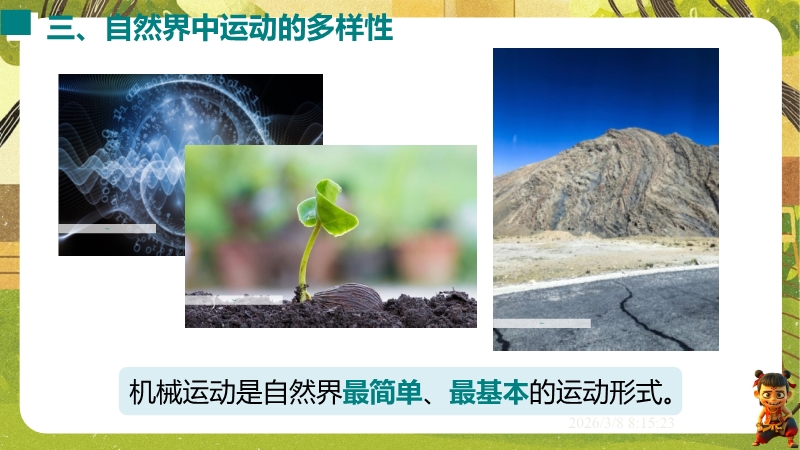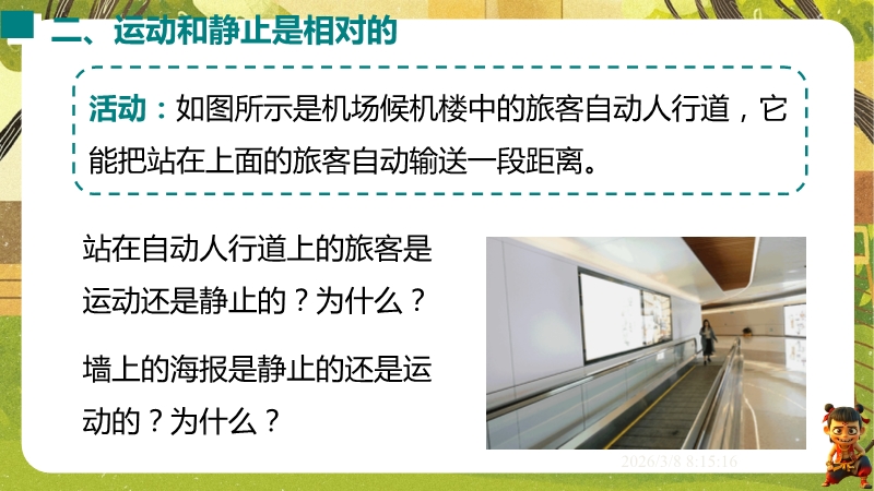 【内容简介】课件聚焦“运动的描述”,涵盖机械运动定义、参照物选择及运动静止相对性等核心知识点。通过孩子游戏活动、诗句情境等导入,引导学生从具体现象到抽象概念,构建“实例感知-定义理解-应用判断”的学习支架。其亮点在于融合科学思维与科学探究,以中考题、“奋斗者”号等新情境及“刻舟求剑”跨学科实例,培养学生模型建构与推理能力。采用活动探究与分层练习,课堂小结系统梳理知识,助力学生深化理解,也为教师提供丰富教学资源。