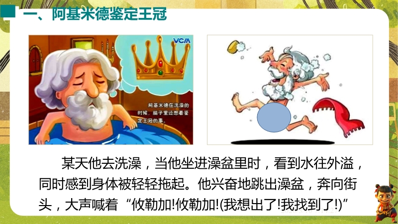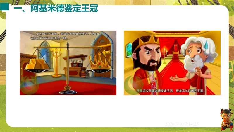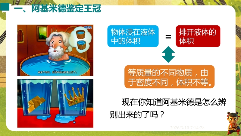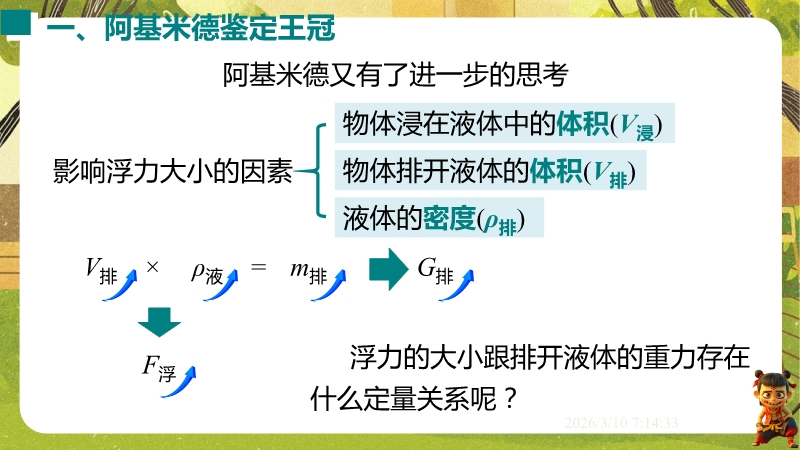 【内容简介】课件聚焦“阿基米德原理”,以阿基米德鉴定王冠故事导入,通过实验探究浮力与排开液体重力的关系,构建从生活现象到科学原理的学习支架,衔接浮力测量与原理应用的知识脉络。其亮点在于以完整实验探究过程培养科学探究能力,结合误差分析和开放性设问发展科学思维,通过中考题和例题强化物理观念。学生能深化原理理解与应用,教师可依托系统内容提升教学效率。