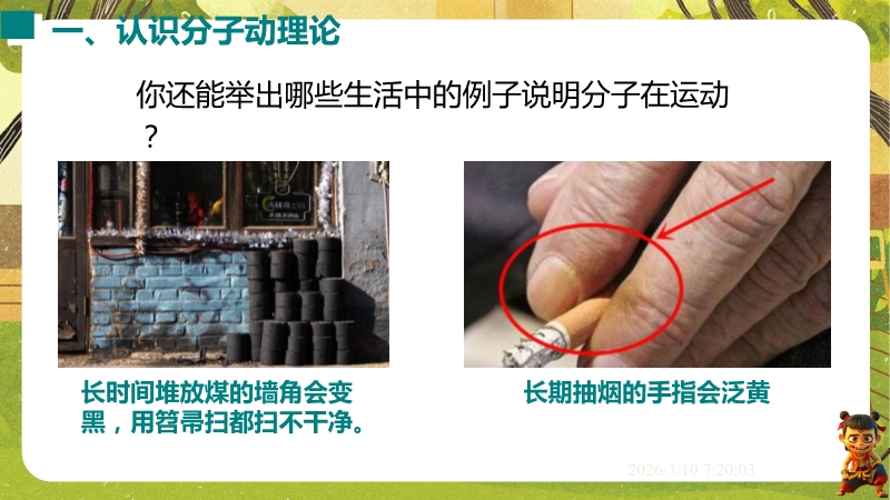 【内容简介】课件聚焦“分子动理论的初步知识”,通过“烟味传播”情境导入,结合香水瓶扩散、红墨水混合等实验,引导学生从生活现象到科学概念,构建分子运动、间隙、作用力及三态分子差异的知识脉络。其亮点在于以实验探究为核心,通过温度影响分子运动实验、铅柱吊钩码等演示,渗透物理观念与科学探究素养,辅以1星基础题和2星情境应用题,帮助学生具象理解抽象概念,教师可借此提升教学互动性与知识落实效率。