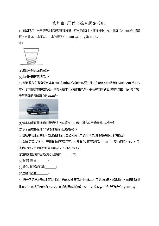 【内容简介】第九章 压强(综合题30道)--2025-2026学年人教版八年级物理全册热点题型专练