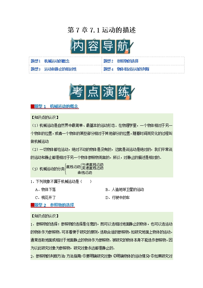 【内容简介】第7章 7.1 运动的描述--2025-2026学年沪粤版物理八年级下册同步考点演练