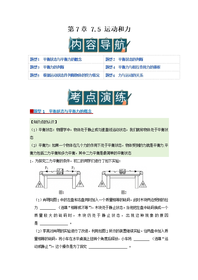 【内容简介】第7章 7.5 运动和力--2025-2026学年沪粤版物理八年级下册同步考点演练