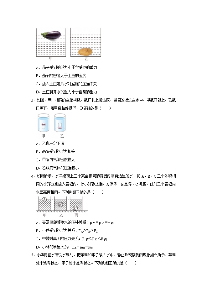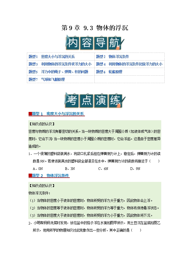 【内容简介】第9章 9.3 物体的浮沉--2025-2026学年沪粤版物理八年级下册同步考点演练