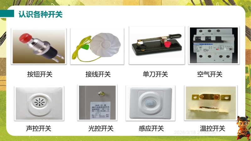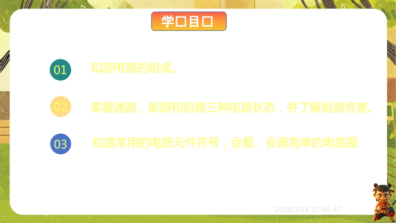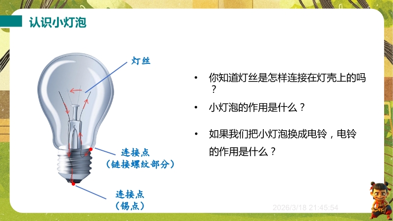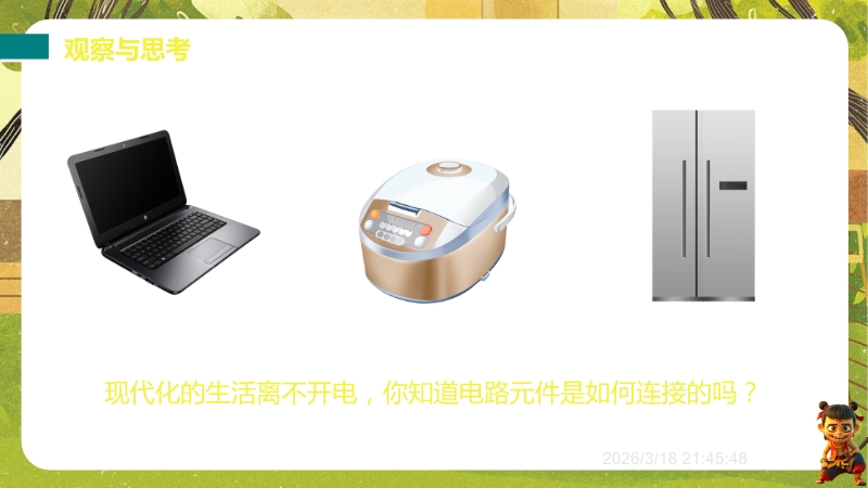 【内容简介】课件聚焦“认识电路”核心知识点,从“现代化生活离不开电”的生活实例导入,通过“使小灯泡持续发光”实验引出电路组成,进而认识电源、用电器等元件作用,过渡到通路、断路、短路状态分析,最终学习电路图绘制,构建从生活到物理、从具体到抽象的学习支架。其亮点在于融合科学探究与物理观念培养,通过实验探究电路组成要素,结合“房卡相当于开关”等生活实例题强化元件作用理解,强调短路危害渗透科学态度与责任。帮助学生建构电路模型,提升科学思维,教师可依托此系统教学提升效率。
