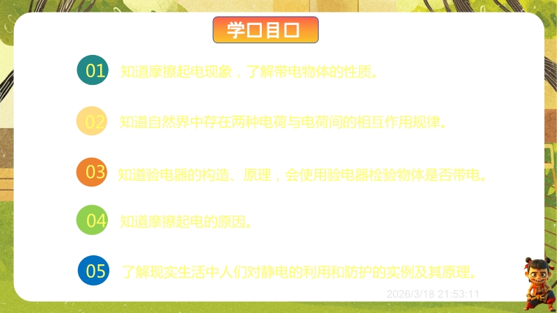 【内容简介】课件围绕“电荷”主题,涵盖摩擦起电现象、两种电荷及相互作用、验电器原理、摩擦起电微观解释和静电应用防护等核心知识点。通过“PVC管摩擦绒布靠近易拉罐”实验导入,引导学生从现象观察到原理探究,构建“现象-规律-本质-应用”的学习支架。其亮点在于注重科学探究与科学思维培养,以实验观察(如验电器构造与原理实验)引导学生建构物理观念,结合油罐车铁链、避雷针等生活实例渗透科学态度与责任。采用“观察-总结-练习”教学环节,帮助学生深化理解,也为教师提供结构化教学资源,提升教学效率。