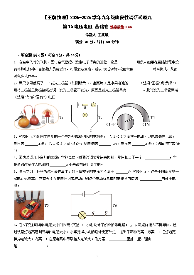 【内容简介】第16章 电压 电阻 专题训练--2025-2026学年九年级阶段性调研试题九(人教版)【王牌物理河南专版】