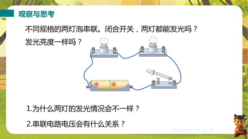 【内容简介】课件聚焦串、并联电路中电压的关系,通过“温故知新”复习电压概念及电压表使用,结合“观察与思考”中不同规格灯泡串联发光差异引出问题,搭建旧知到新知的学习支架。其亮点是以科学探究为主线,完整呈现实验设计、数据收集与分析过程,结合例题和生活实例(如手电筒灯珠、家庭电路小彩灯),培养科学思维与物理观念。学生能提升探究能力和知识应用能力,教师可直接使用结构化教学资源提高效率。
