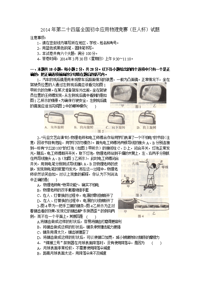 (94第四届)1.按我国交通管理部门最近规定,坐在小汽车前排的司机和乘客都应在胸前系上安全带,这主要是为了减轻在下列哪种情况出现时可能对人造成的伤害。 [ ]