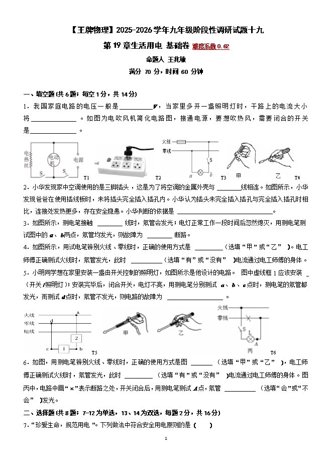- 70第19章 生活用电 培优训练--2025-2026学年九年级阶段性调研试题二十(人教版)【王牌物理河南…