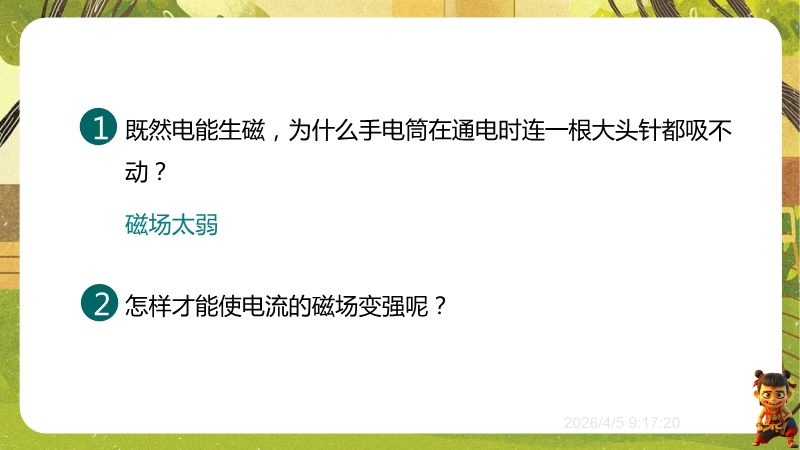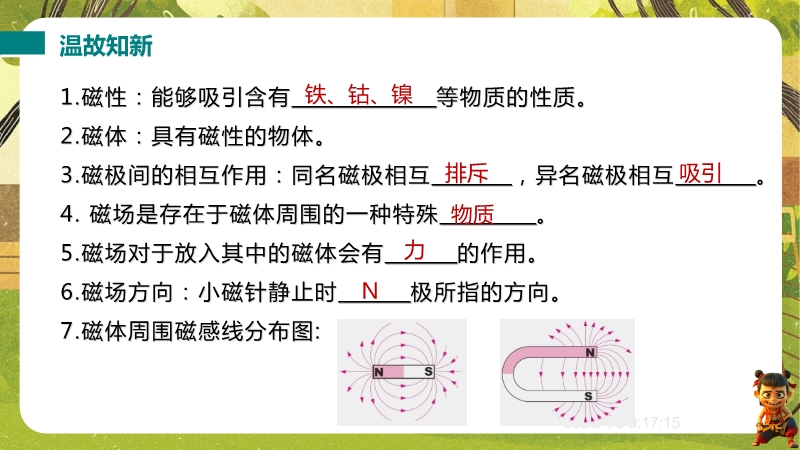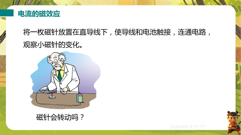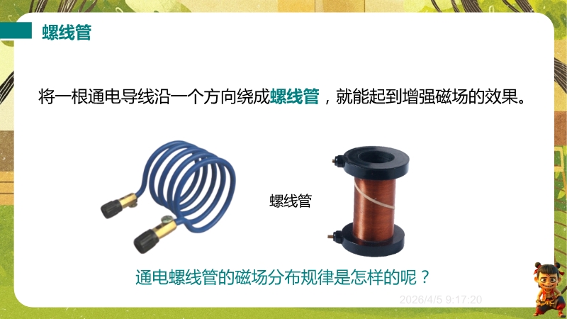 【内容简介】课件聚焦“电流的磁场”,核心涵盖电流的磁效应、通电螺线管磁场及右手螺旋定则。通过“温故知新”复习磁体、磁场等旧知,结合“观察与思考”对比电与磁性质引出联系,以奥斯特实验为桥梁构建新旧知识学习支架。其亮点在于以科学探究为主线,通过奥斯特实验现象分析培养科学思维,用表格对比条形磁体与螺线管磁场深化物理观念,融入中考真题练习提升应用能力。助力学生建立电磁联系认知,教师可依托此资料高效开展探究式教学。