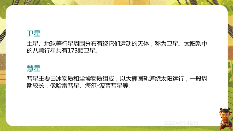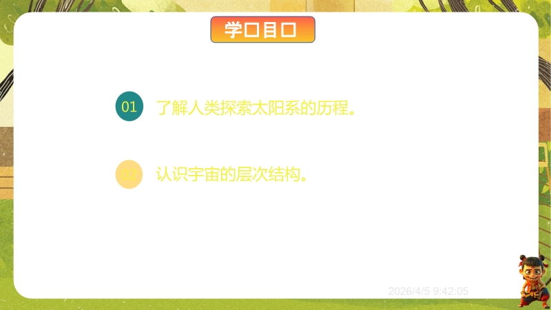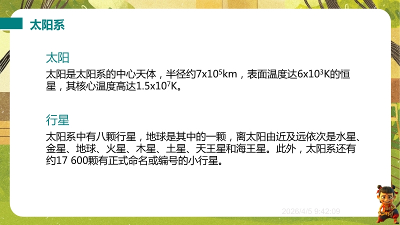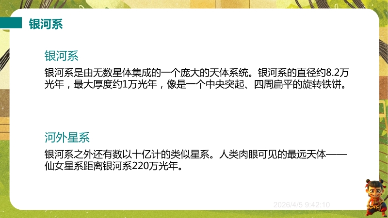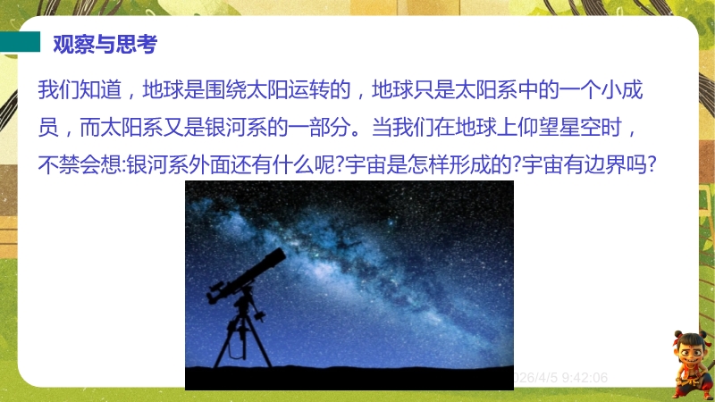 【内容简介】物理课件聚焦“浩瀚的宇宙”,核心讲解宇宙层次结构及人类探索历程,通过“观察与思考”中“银河系外有什么”等问题导入,从地球、太阳系到银河系、河外星系,构建层次化学习支架。其亮点在于结合科学思维(如“地心说—日心说—现代宇宙观”的科学推理)与科学态度与责任(如中国“神舟”五号等航天成就),通过练习题巩固物理观念,帮助学生构建知识体系,教师可高效开展教学。