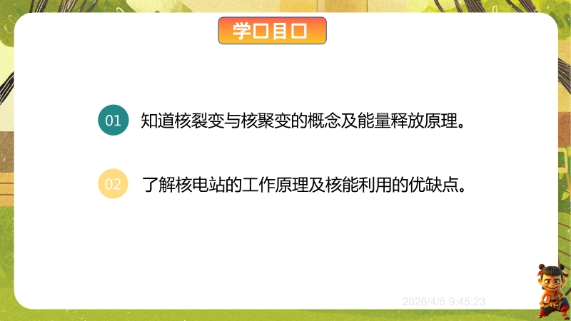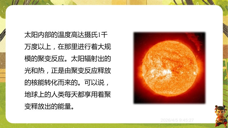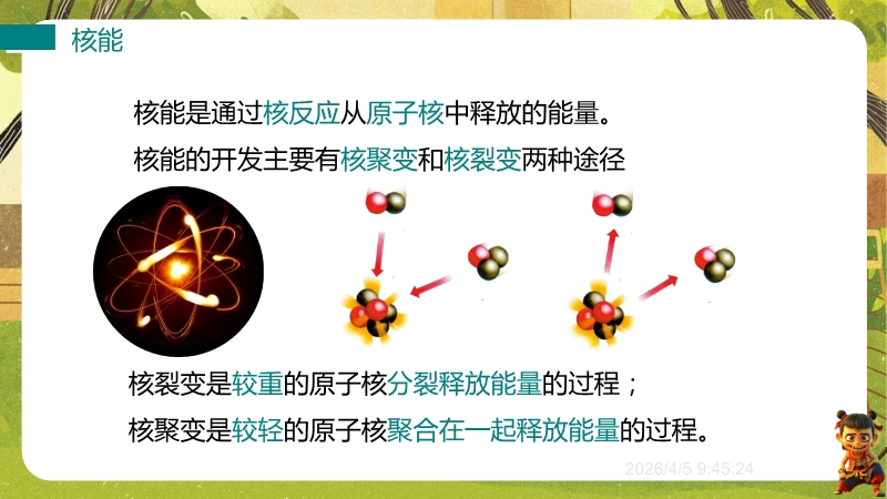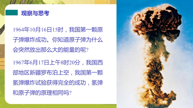 【内容简介】此课件聚焦“核能的开发与利用”,核心涵盖核裂变与核聚变的概念及能量释放原理,核电站工作原理及核能利用优缺点。通过我国第一颗原子弹、氢弹爆炸实例提问导入,引导学生从核能产生途径(裂变、聚变)到应用(核电站、武器)再到核安全,构建完整知识脉络。其亮点在于融合科学态度与责任(核安全措施、国际共识)和科学思维(链式反应模型建构),结合大亚湾核电站等实例、福岛核污染事件分析及多样化习题(含安全意识题、实际应用题)。小结以知识框架梳理内容,助力学生系统认知,增强社会责任意识,教师可借助实例与习题提升教学效率。