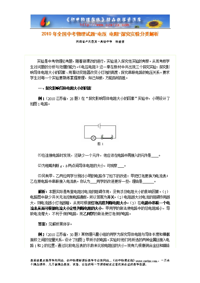 2010年全国中考物理试题“电压 电阻”探究实验分类解析