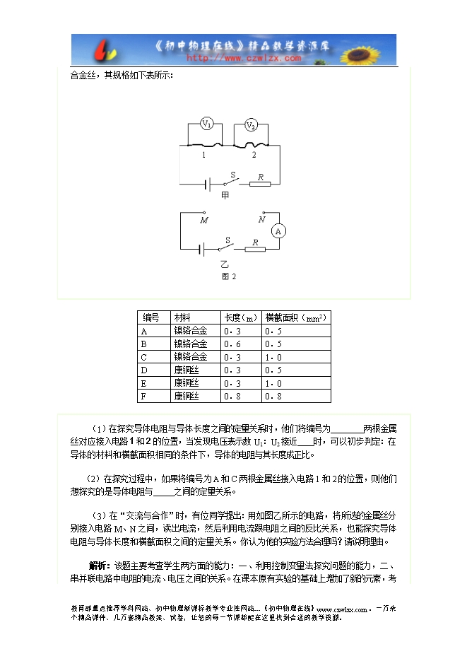 例2(2010江苏省,30题)某物理兴趣小组的同学为探究导体电阻与导体长度和横截面积之间的定量关系,设计了如图2甲所示的电路。实验时他们将所选的两种金属丝接入电路1和2的位置,通过比较电压表的示数来比较电阻丝的大小。现有几根康铜合金丝和镍铬合金丝,其规格如下表所示: