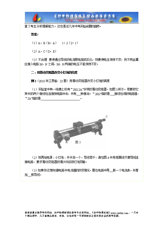 【内容简介】验是中考物理必考题,随着新课改的进行,实验进入探究性实验的考察。从而考核学生对问题的分析与处理的能力。《电压电阻》这一章在教材中共出现三个探究实验:探究影响导体电阻大小的因素、用滑动变阻器改变小灯泡的亮度、探究串联电路的电压关系。要求学生对每一个实验要熟练掌握原理,知己知彼,方能百战百胜。 一、探究影响导体电阻大小的因素
