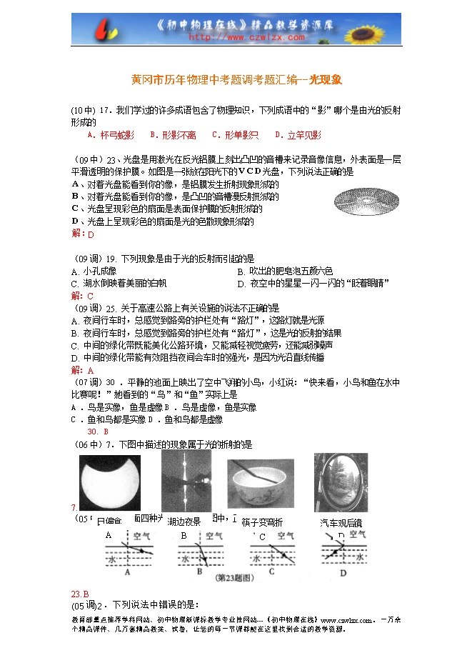【内容简介】(10中) 17.我们学过的许多成语包含了物理知识,下列成语中的“影”哪个是由光的反射形成的