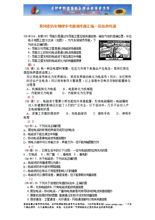 黄冈市历年物理中考题调考题汇编--信息的传递