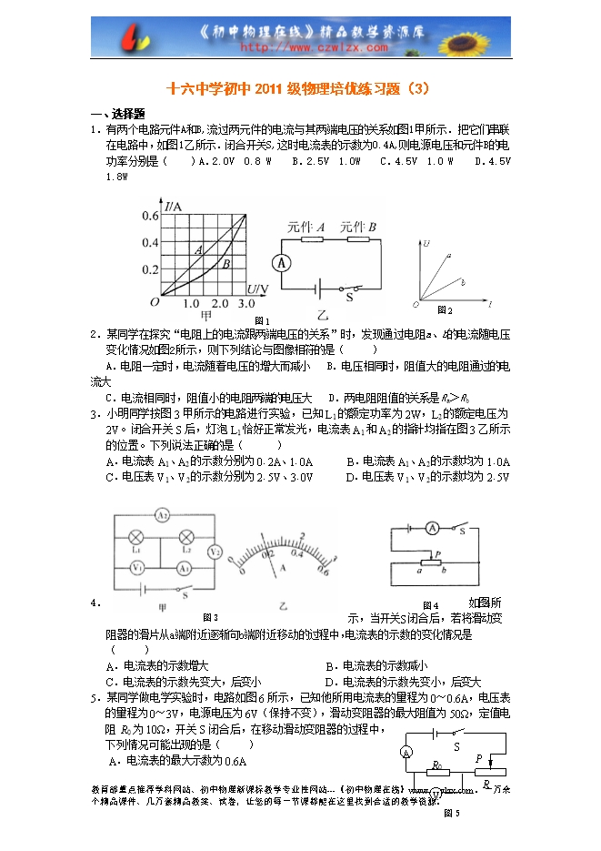 1.有两个电路元件A和B,流过两元件的电流与其两端电压的关系如图1甲所示.把它们串联在电路中,如图1乙所示.闭合开关S,这时电流表的示数为0.4A,则电源电压和元件B的电功率分别是( )A.2.0V 0.8 W B.2.5V 1.0W C.4.5V 1.0 W D.4.5V 1.8W