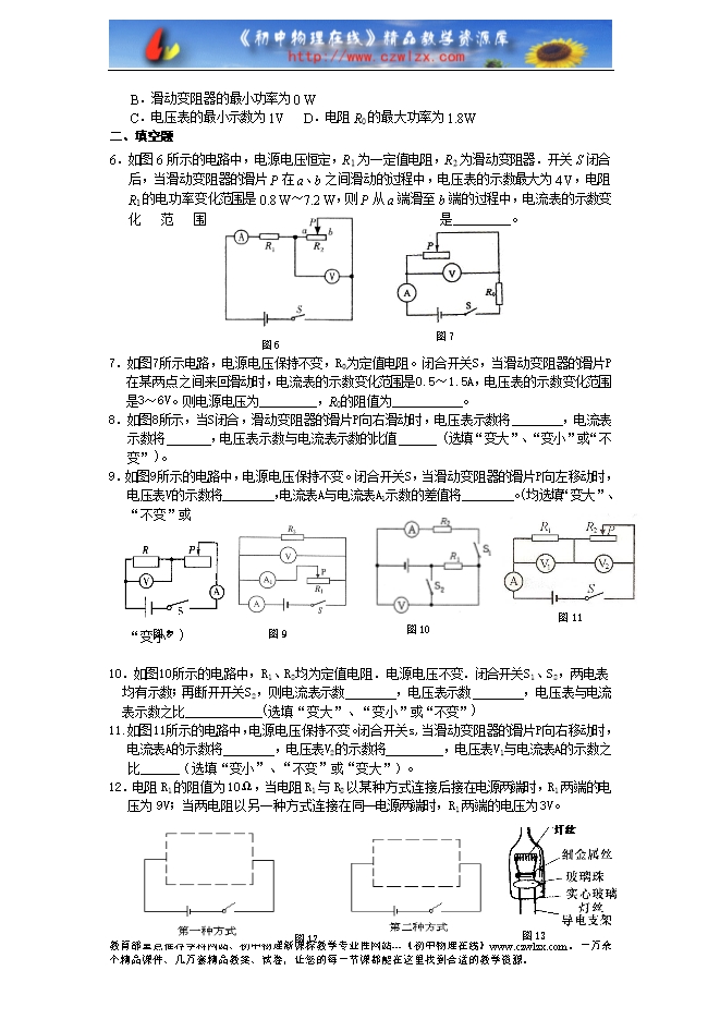 5.某同学做电学实验时,电路如图6所示,已知他所用电流表的量程为0~0.6A,电压表的量程为0~3V,电源电压为6V(保持不变),滑动变阻器的最大阻值为50Ω,定值电阻 R0为10Ω,开关S闭合后,在移动滑动变阻器的过程中,下列情况可能出现的是( )