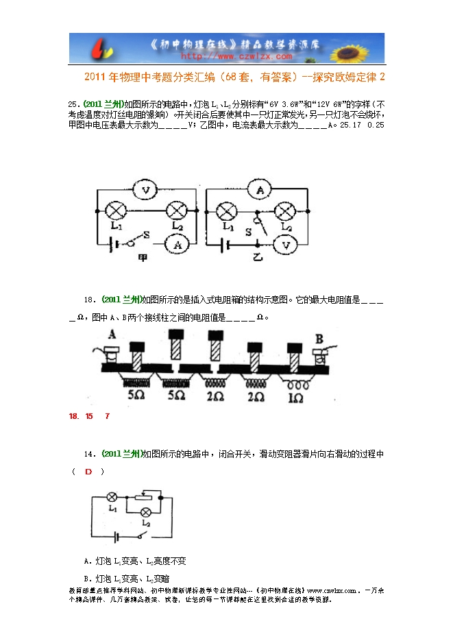 【内容简介】25.(201l兰州)如图所示的电路中,灯泡L1、L2分别标有“6V 3.6W”和“12V 6W”的字样(不考虑温度对灯丝电阻的影响)。开关闭合后要使其中一只灯正常发光,另一只灯泡不会烧坏,甲图中电压表最大示数为____V;乙图中,电流表最大示数为____A。25.17 0.25