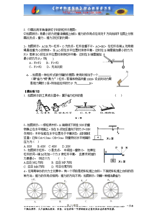 1、画出使杠杆AB在图示位置静止时所用最小力F的作用点和方向。