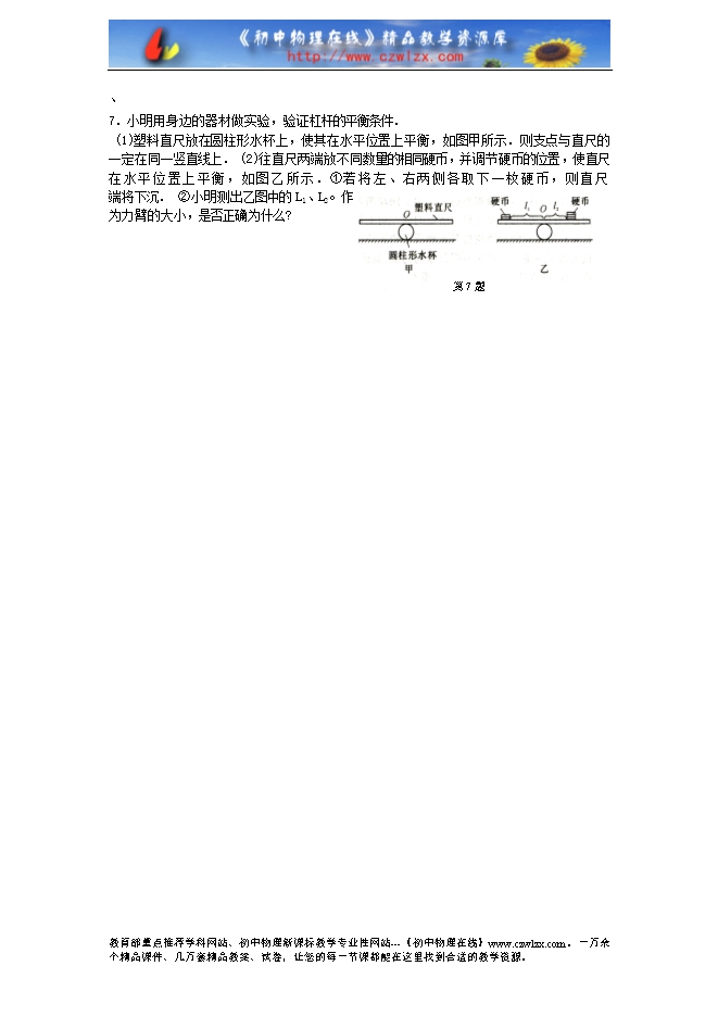〖例3〗密度均匀的直尺AB放在水平桌面上,尺子伸出桌面的部分OB是全尺长的三分之一.当B端挂5N的重物G时,直尺的A端刚刚开始翘起,如图8所示,则此直尺受到的重力是 ( )