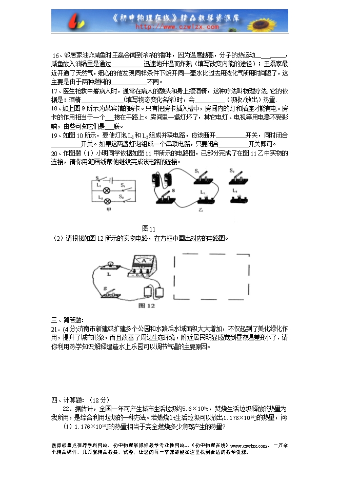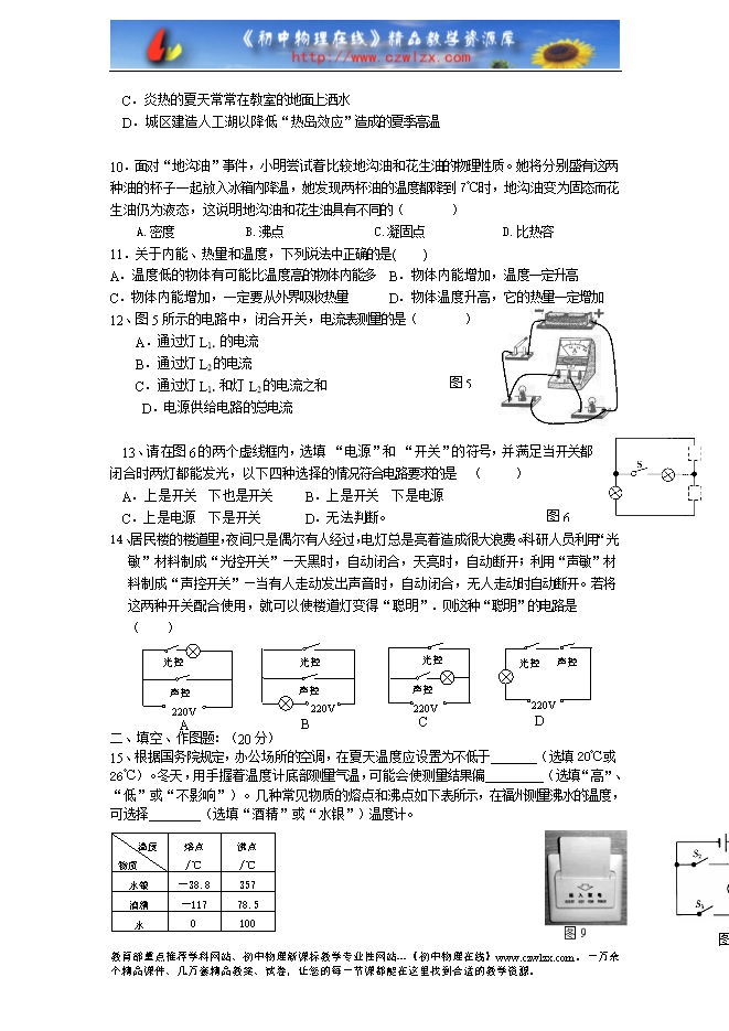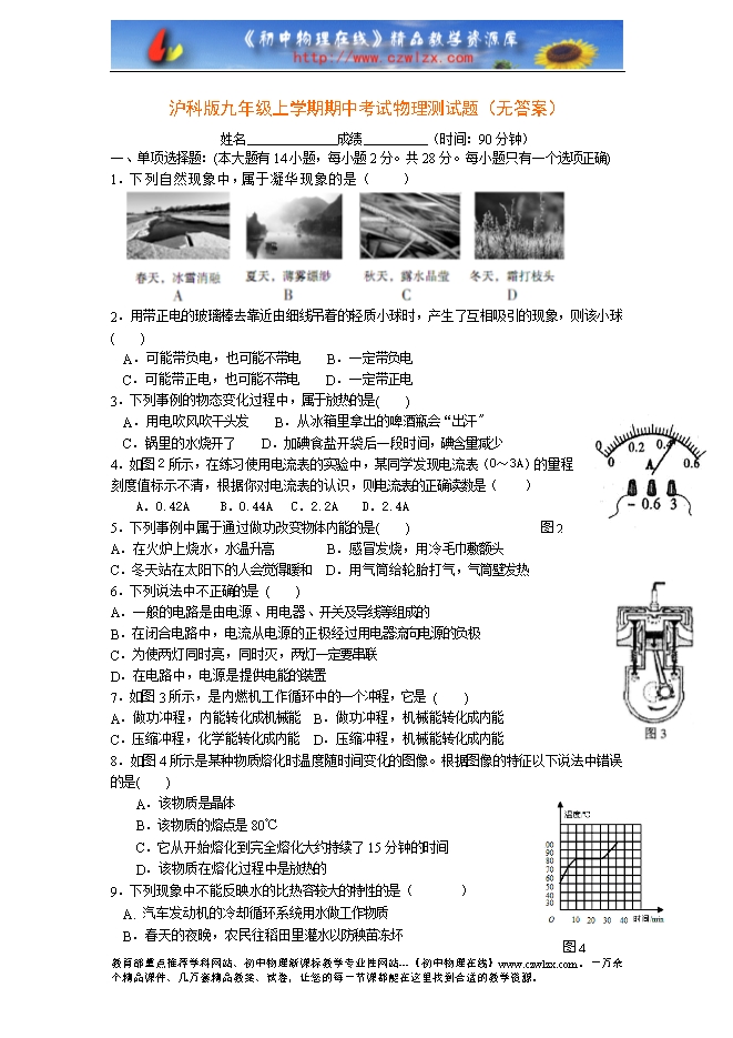 沪科版九年级上学期期中考试物理测试题(无答案)