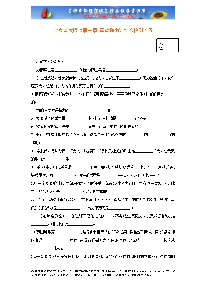 - 下一份试卷:北京课改版《第三章 运动和力》综合检测B卷