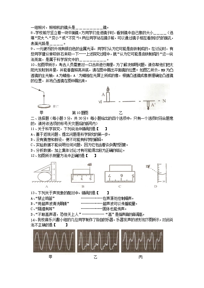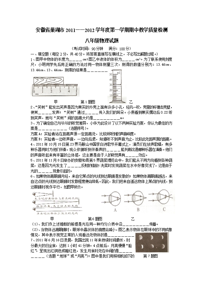 安徽省巢湖市2011-2012学年度第一学期期中教学质量检测八年级物理试题及答案