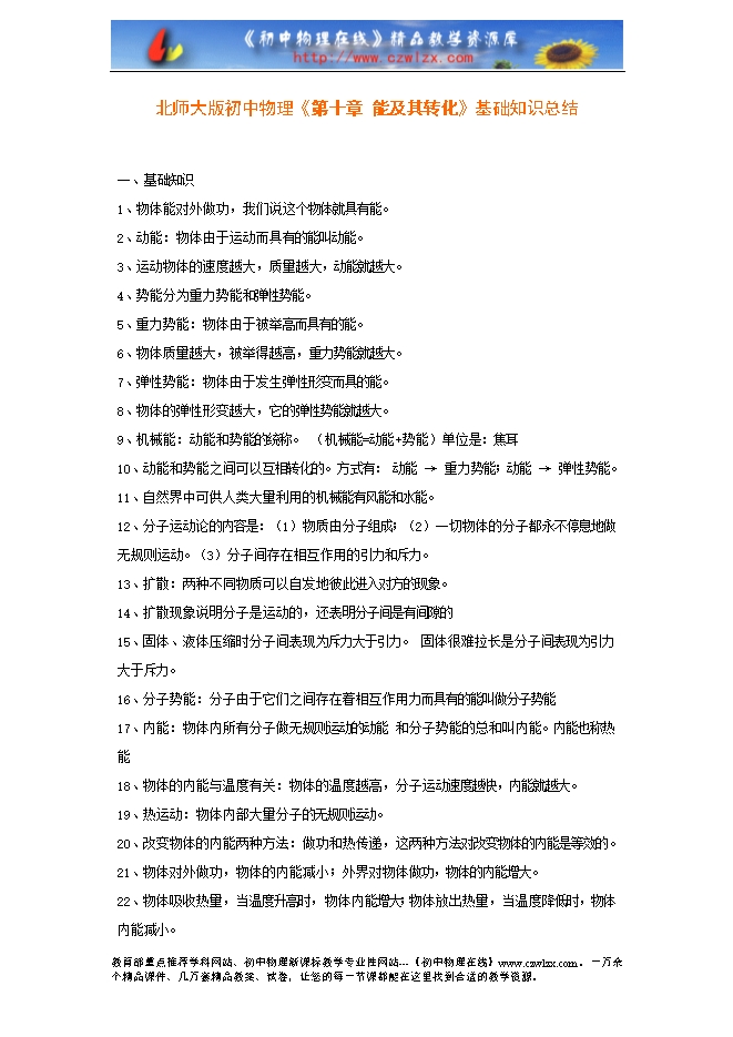 北师大版初中物理《第十章 能及其转化》基础知识总结