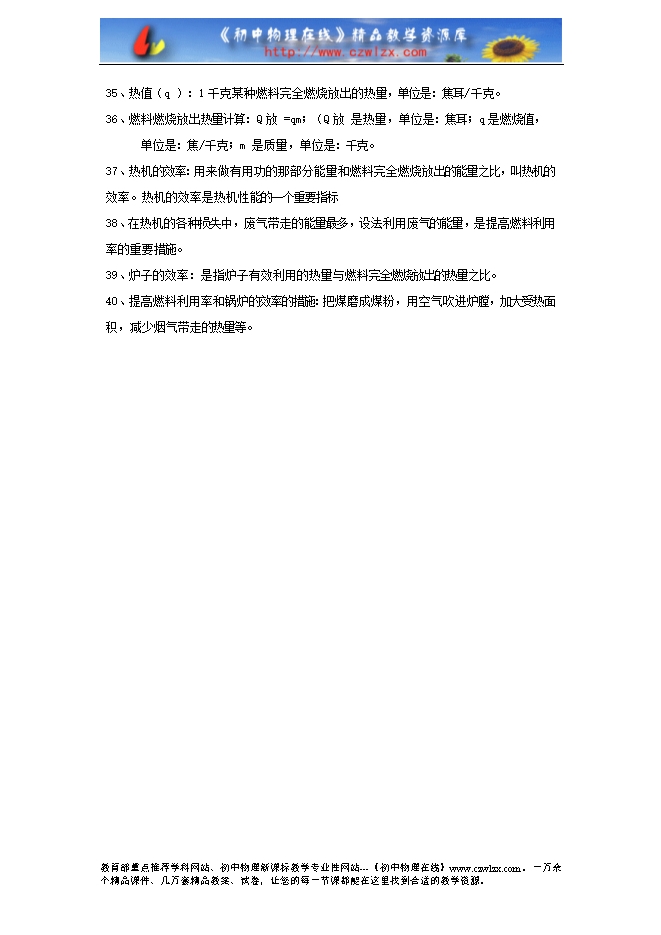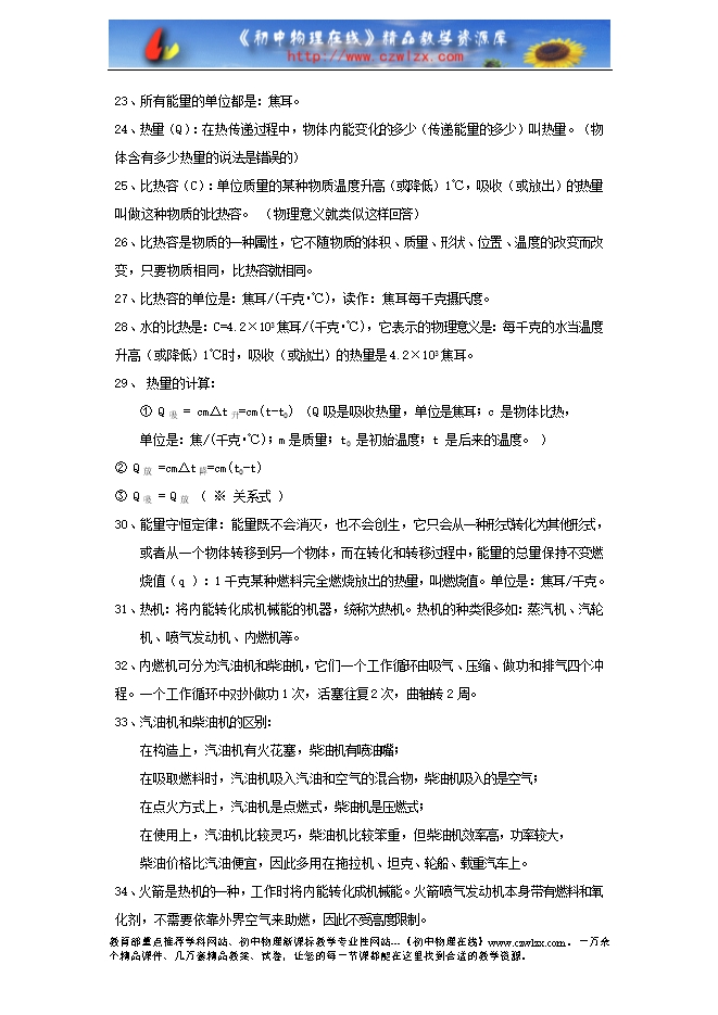 9、机械能:动能和势能的统称。 (机械能=动能+势能)单位是:焦耳