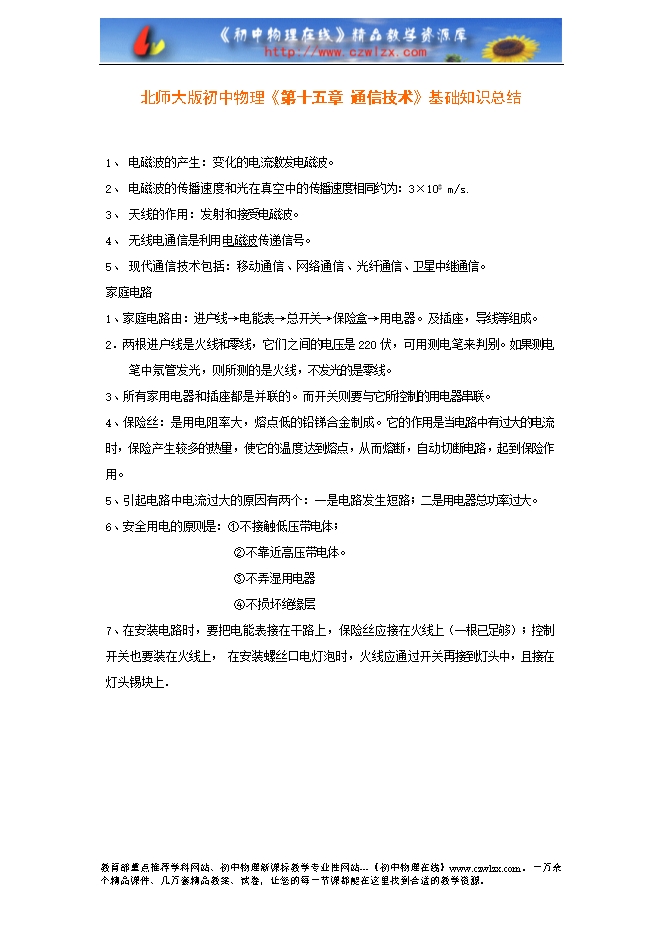 北师大版初中物理《第十五章 通信技术》基础知识总结