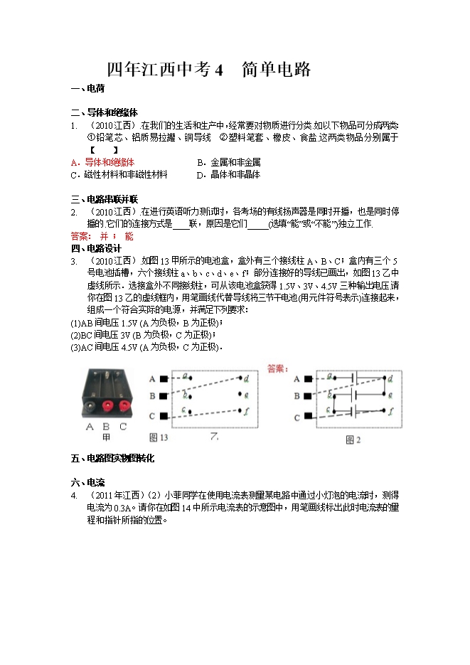 一、电荷 二、导体和绝缘体 1. (2010江西).在我们的生活和生产中,经常要对物质进行分类.如以下物品可分成两类:①铅笔芯、铝质易拉罐、铜导线 ②塑料笔套、橡皮、食盐.这两类物品分别属于【 】 A.导体和绝缘体 B.金属和非金属 C.磁性材料和非磁性材料 D.晶体和非晶体 三、电路串联并联 2. (2010江西).在进行英语听力测试时,各考场的有线扬声器是同时开播,也是同时停播的.它们的连接方式是____联,原因是它们_____(选填“能”或“不能”)独立工作. 答案: 并 ; 能四、电路设计 3. (2010江西).如图13甲所示的电池盒,盒外有三个接线柱A、B、C;盒内有三个5号电池插槽,六个接线柱a、b、c、d、e、f;部分连接好的导线已画出,如图13乙中虚线所示.选接盒外不同接线柱,可从该电池盒获得1.5V、3V、4.5V三种输出电压.请你在图13乙的虚线框内,用笔画线代替导线将三节干电池(用元件符号表示)连接起来,组成一个符合实际的电源,并满足下列要求: (1)AB间电压1.5V (A为负极,B为正极); 【详细内容请下载查看】