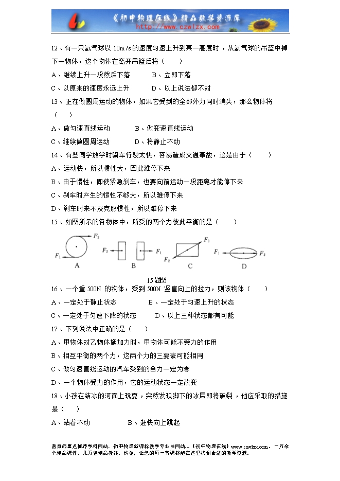 教科版2011—2012学年度八年级下学期期中考试物理试题