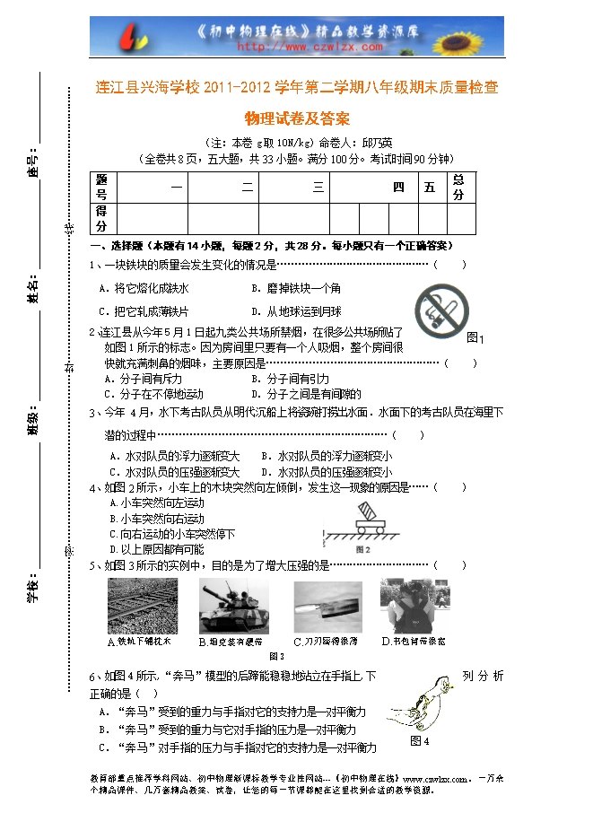 连江县兴海学校2011-2012学年第二学期八年级期末质量检查物理试卷及答案(沪科版)