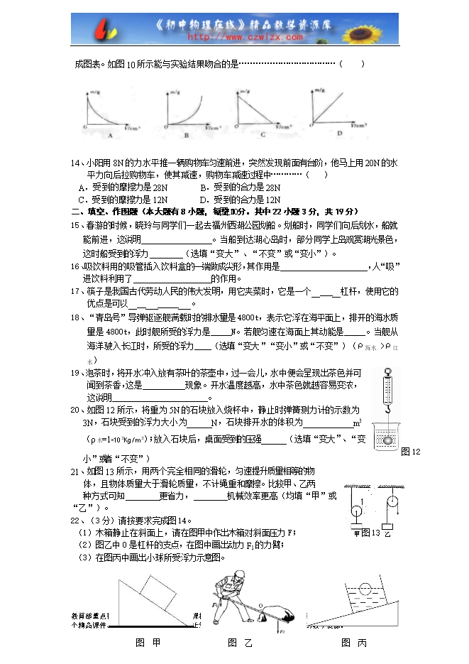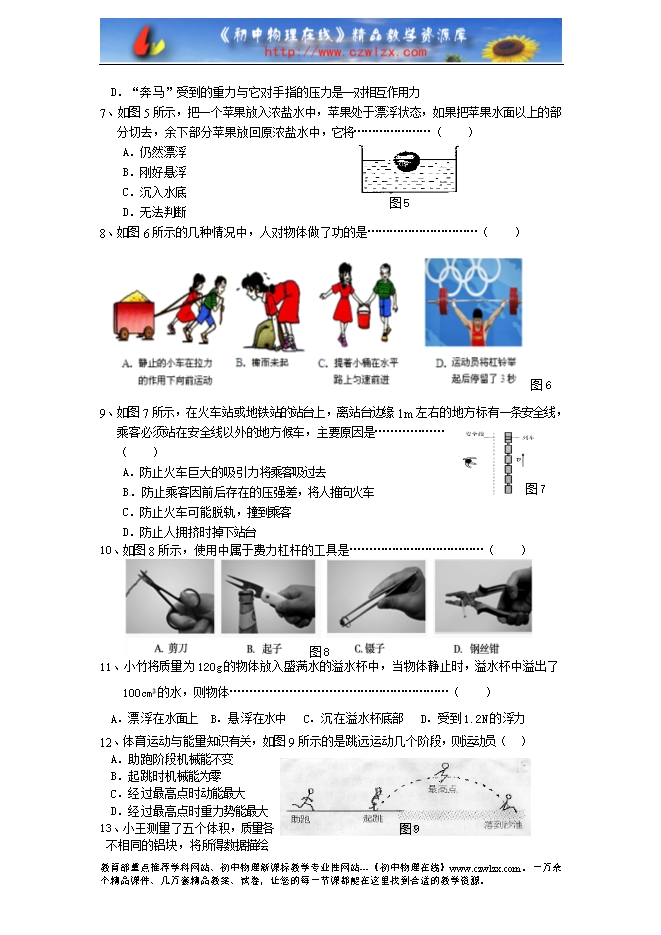 4、如图2所示,小车上的木块突然向左倾倒,发生这一现象的原因是……( )